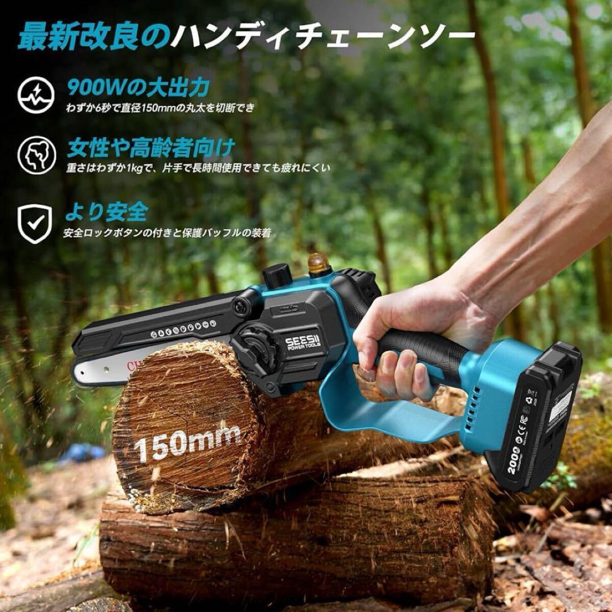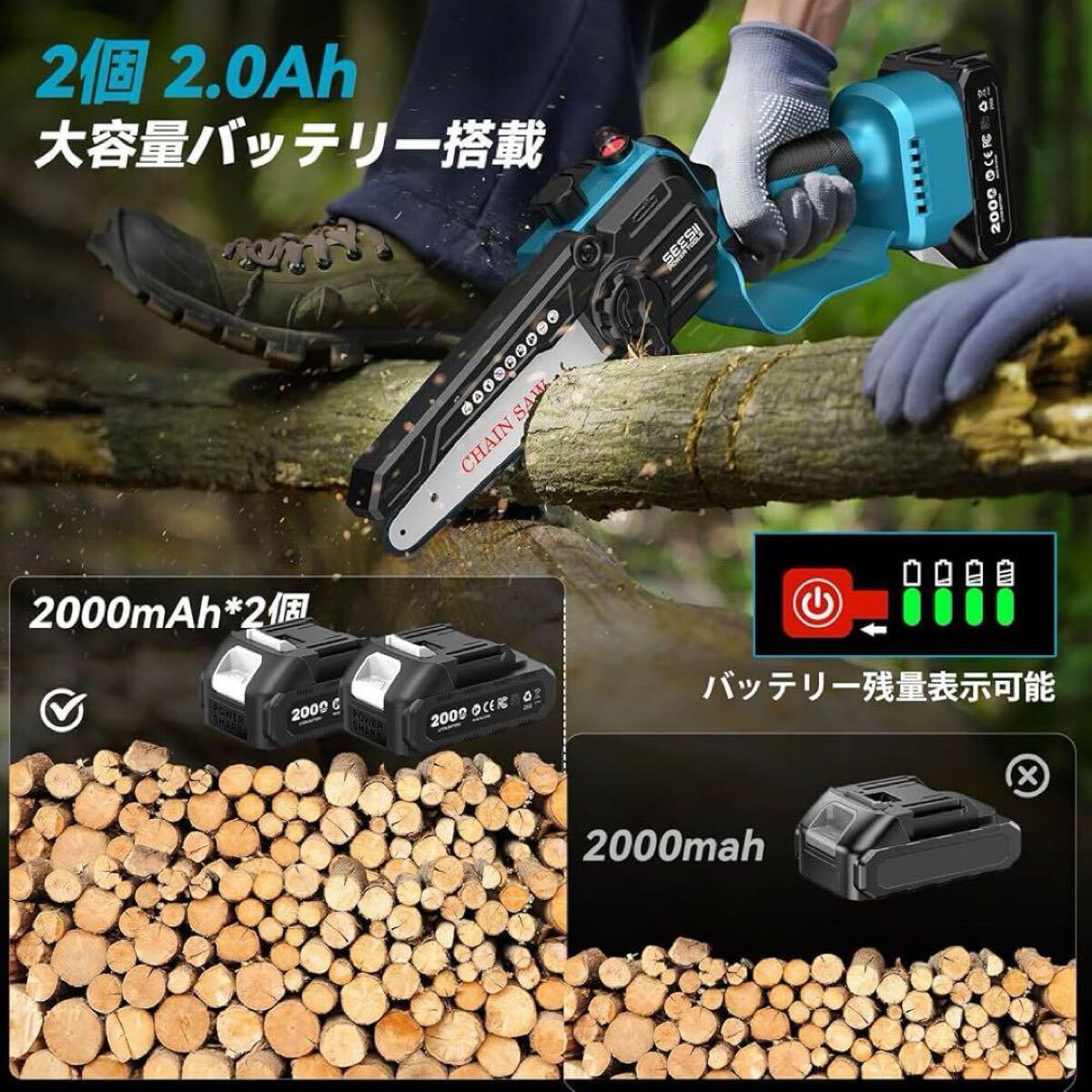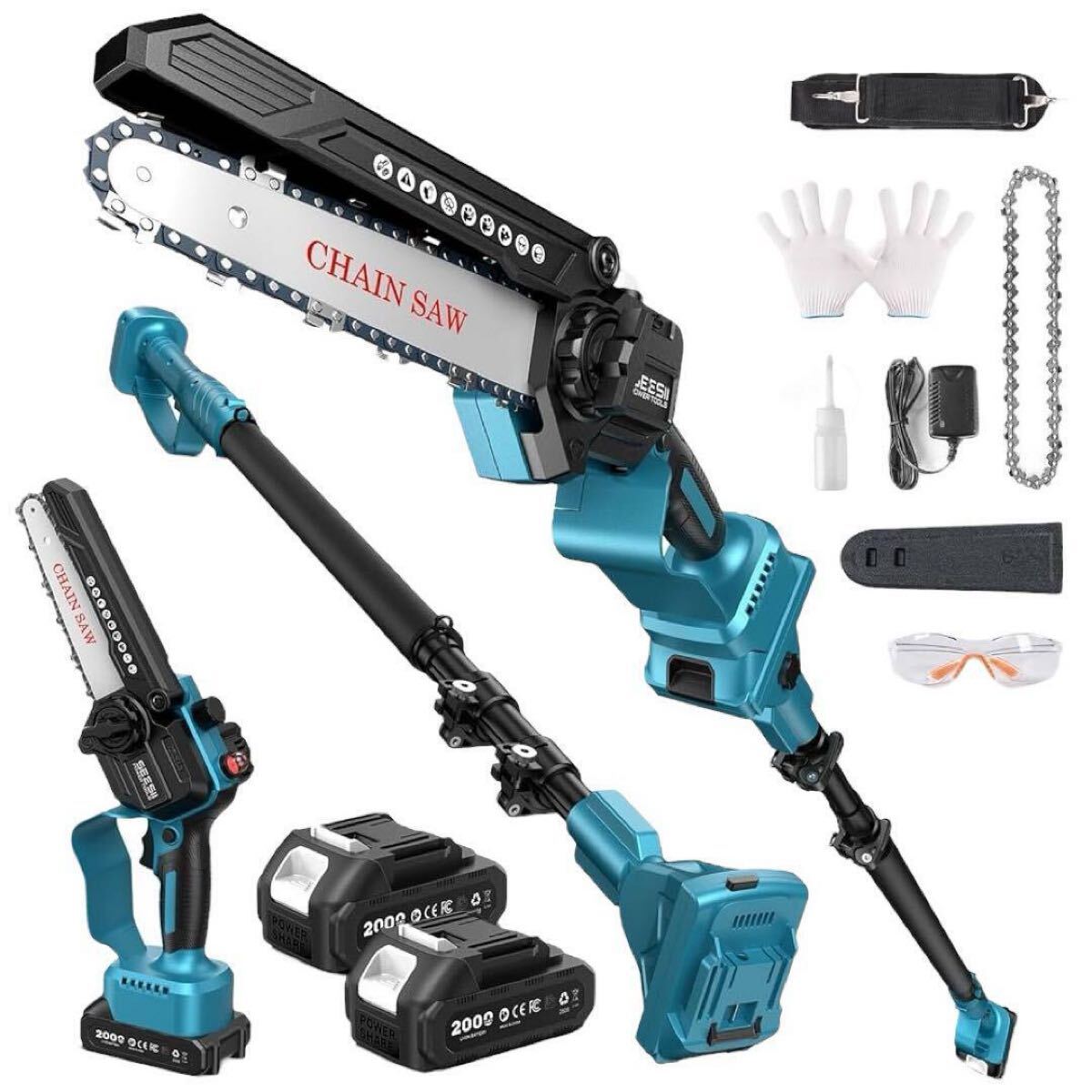 セット内容:6インチ電動チェーンソー×1、延長ポール×1、大容量バッテリー×2、充電器×1、予備チェーン×1、バー保護カバー×1、ショルダーベルト×1、保護メガネ×1、作業用手袋×1、日本語取扱説明書×1
