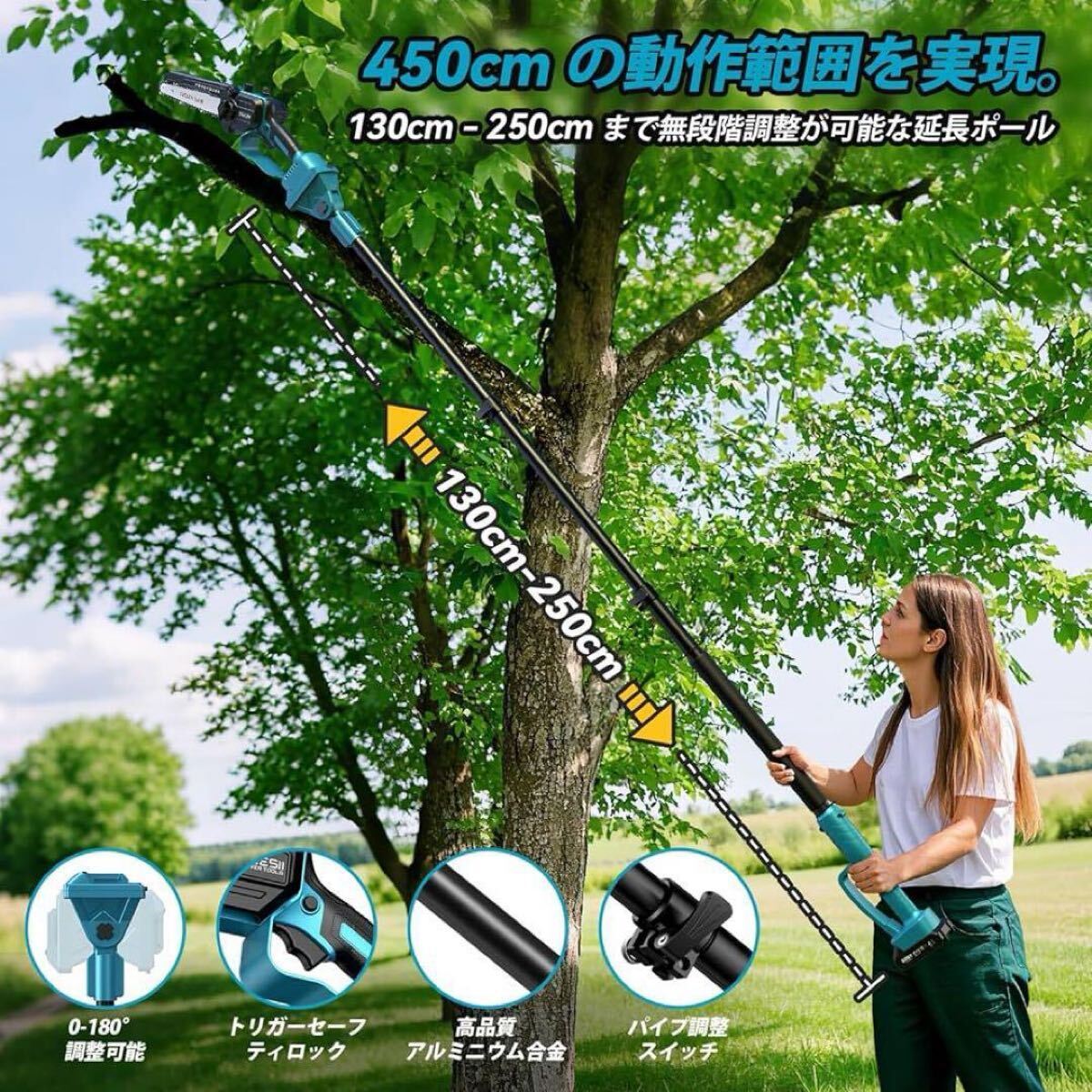 ポール付き高枝電動チェーンソーとして高所の枝を楽に剪定できるほか、ポールを取り外せば6インチの手持ちチェーンソーとしても使用可能。低所での木材や枝の切断にも最適です。作業シーンや用途に応じて柔軟に使い分けられます。伸縮ポールは無段階調節式で130cmから最長250cmまで伸ばせ、最大到達範囲は約450cmと広く、高所作業も安全かつ効率的に行えます。さらにヘッド部分は0〜180°の角度調整が可能で、複雑な角度の枝切りもスムーズ。果樹、木材、竹、庭木などの剪定や伐採に最適な一台。