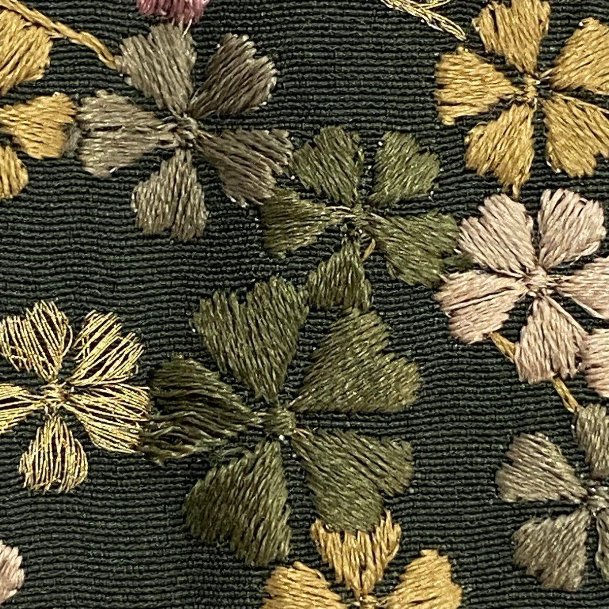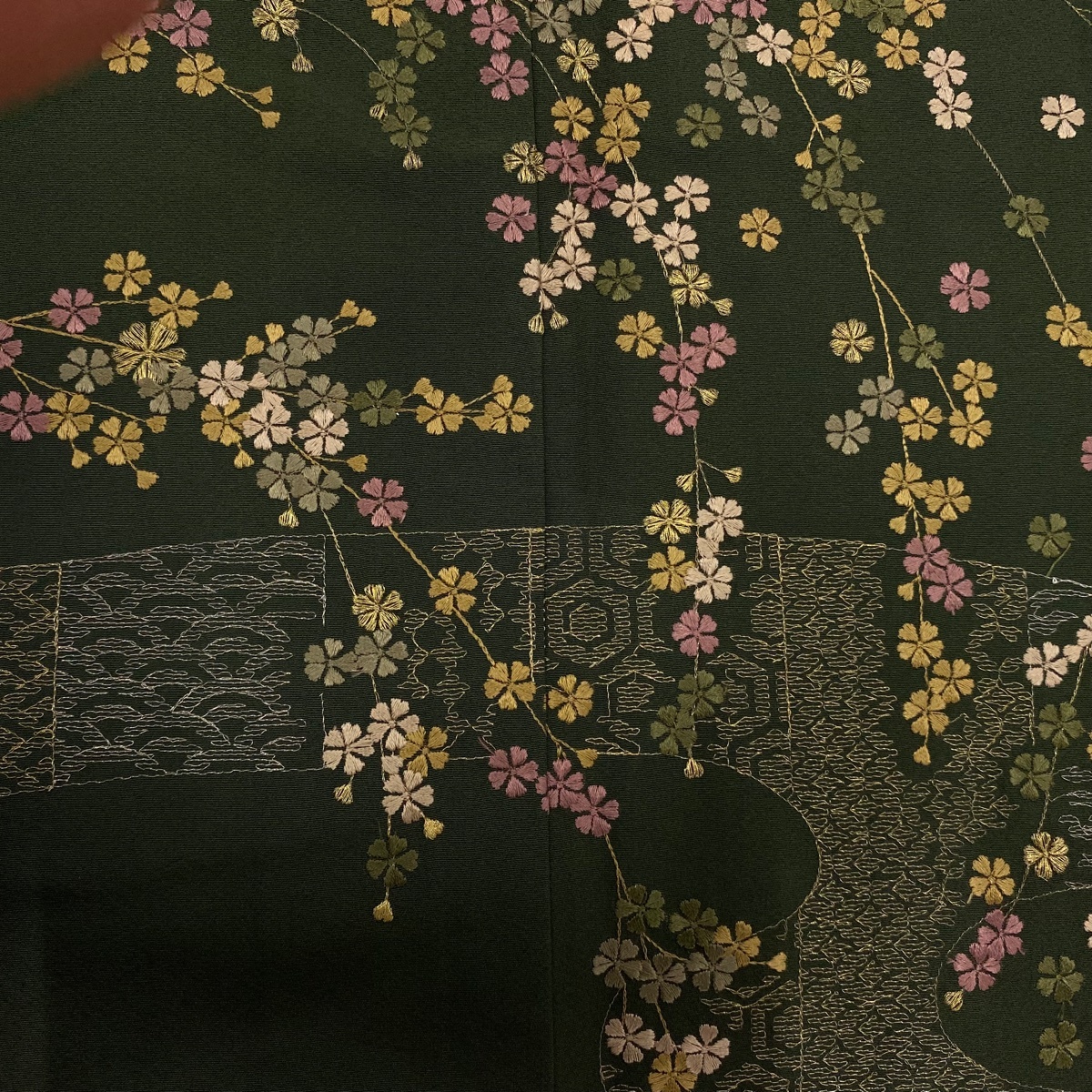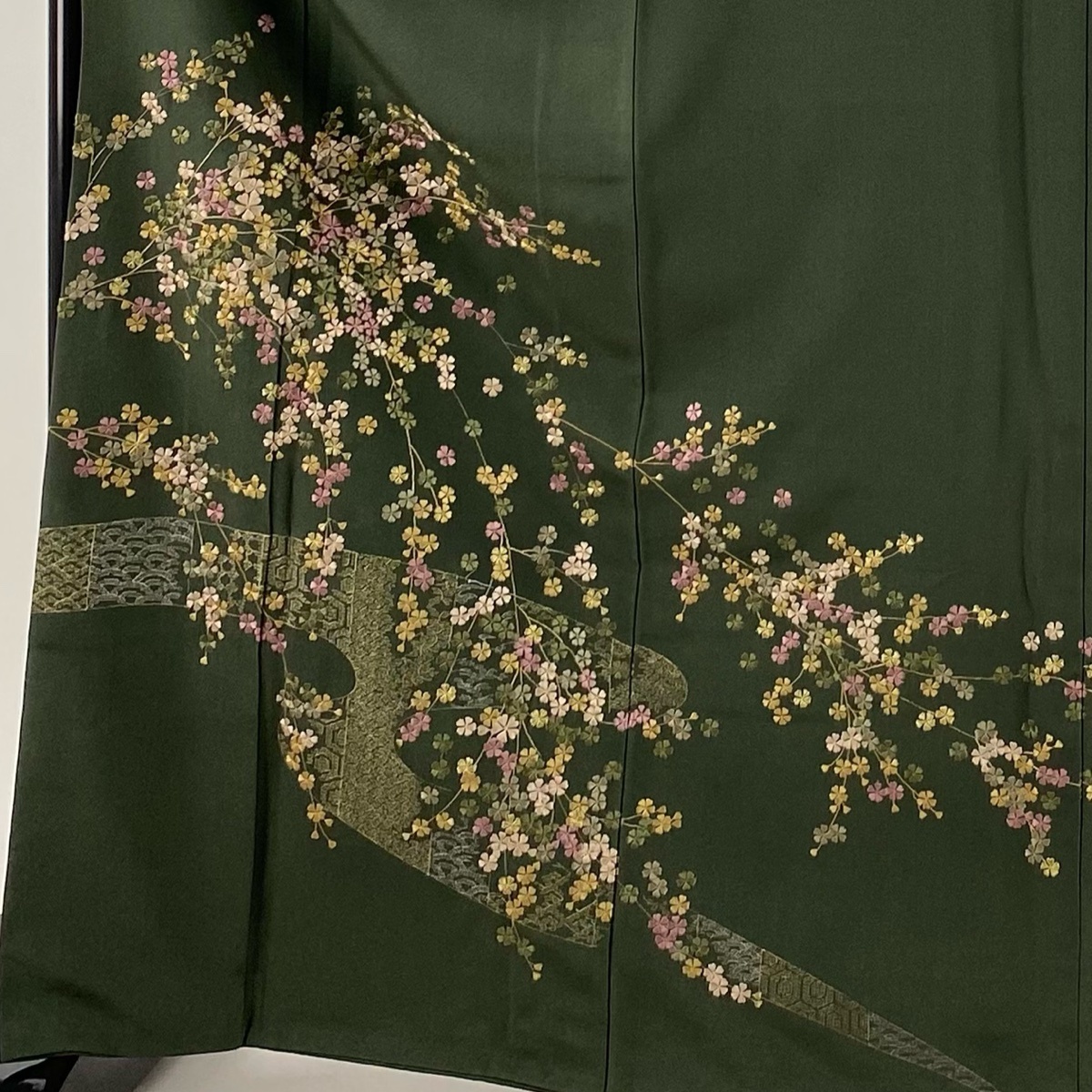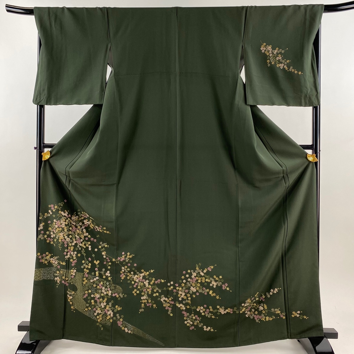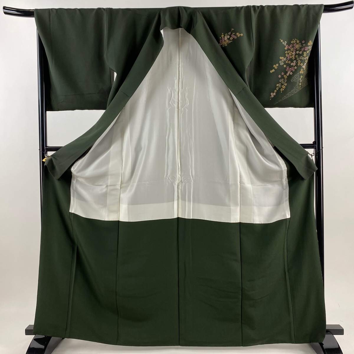 | 付下げ 名品 枝花 霞 金糸 刺繍 深緑 袷 身丈167 裄丈68.5 L 正絹 【中古】 |