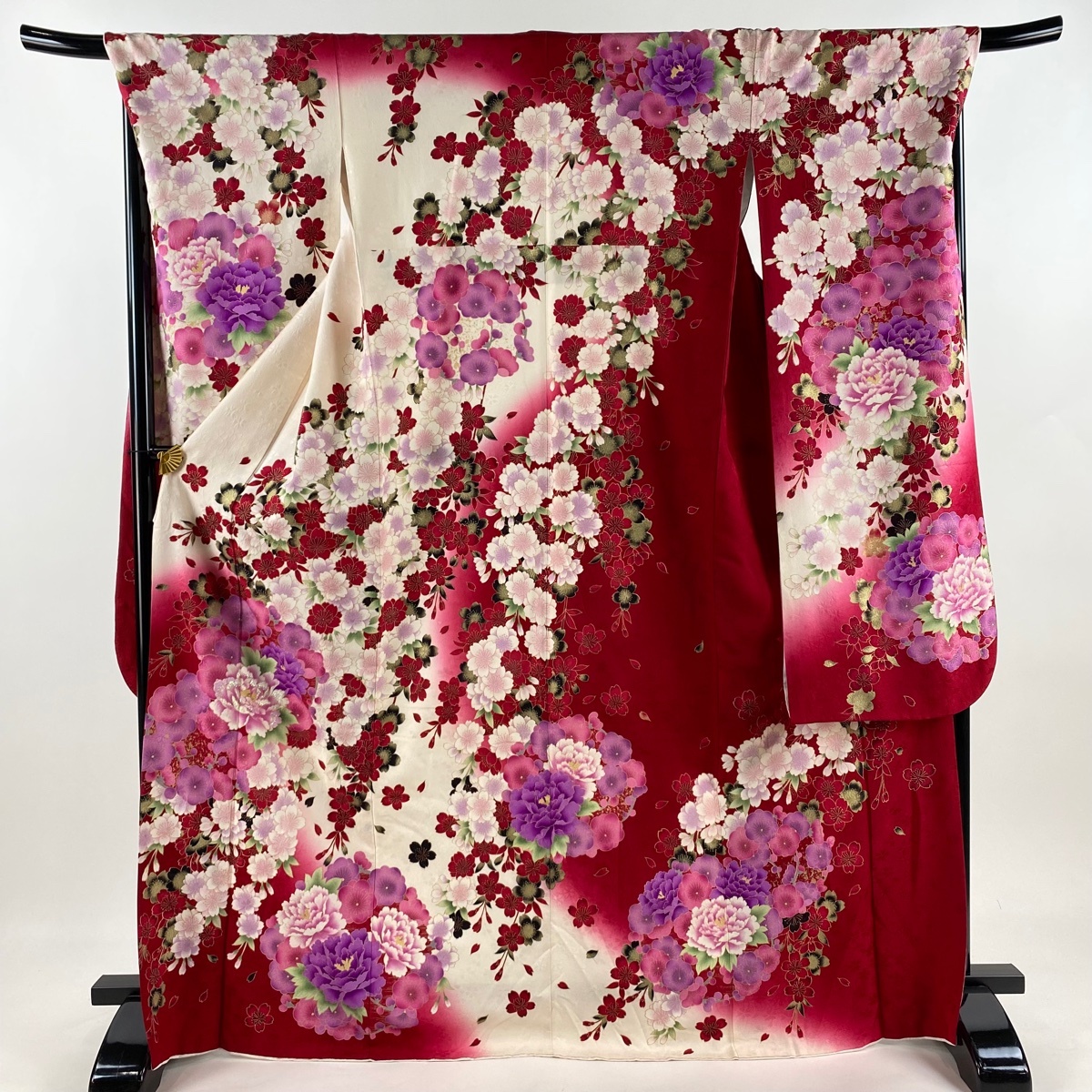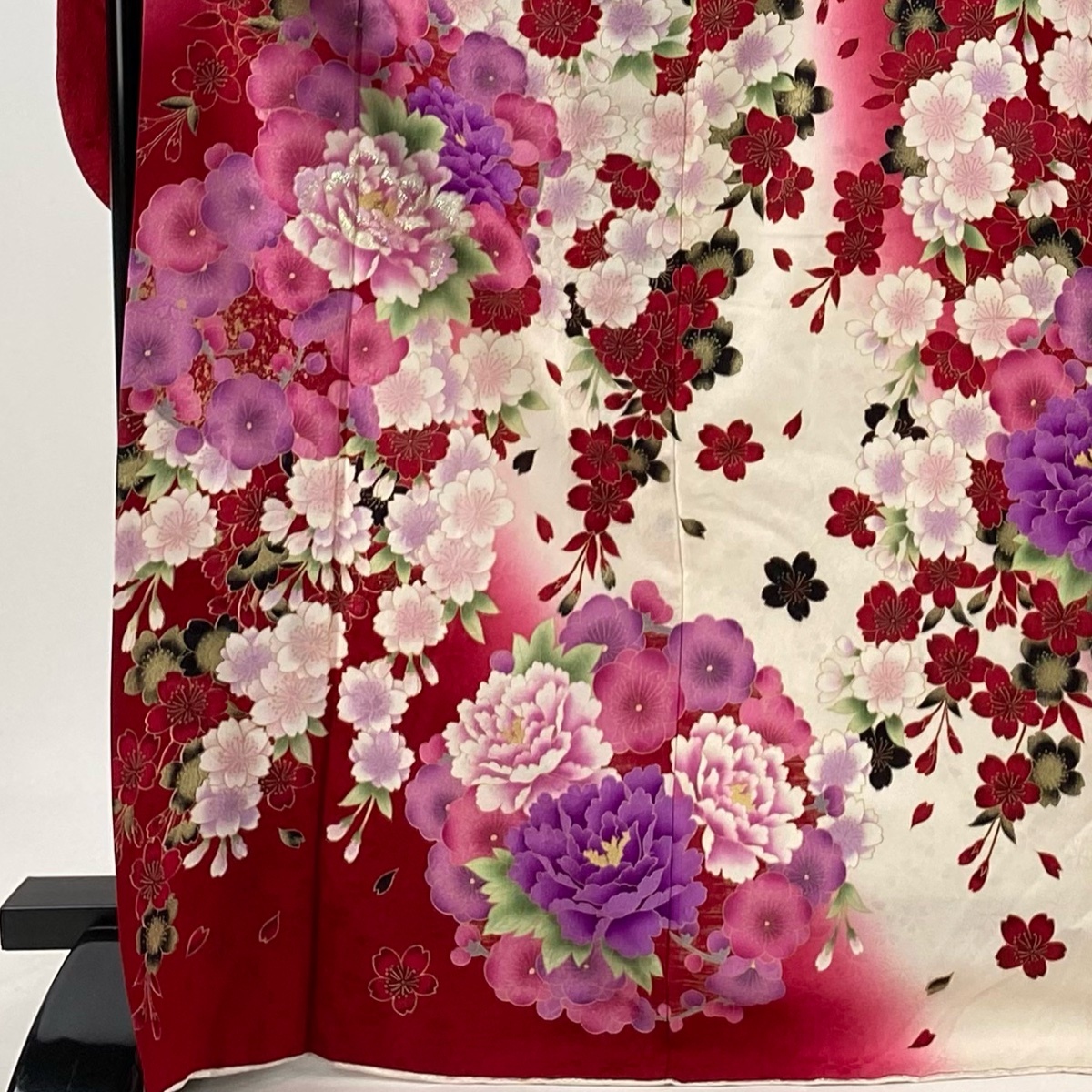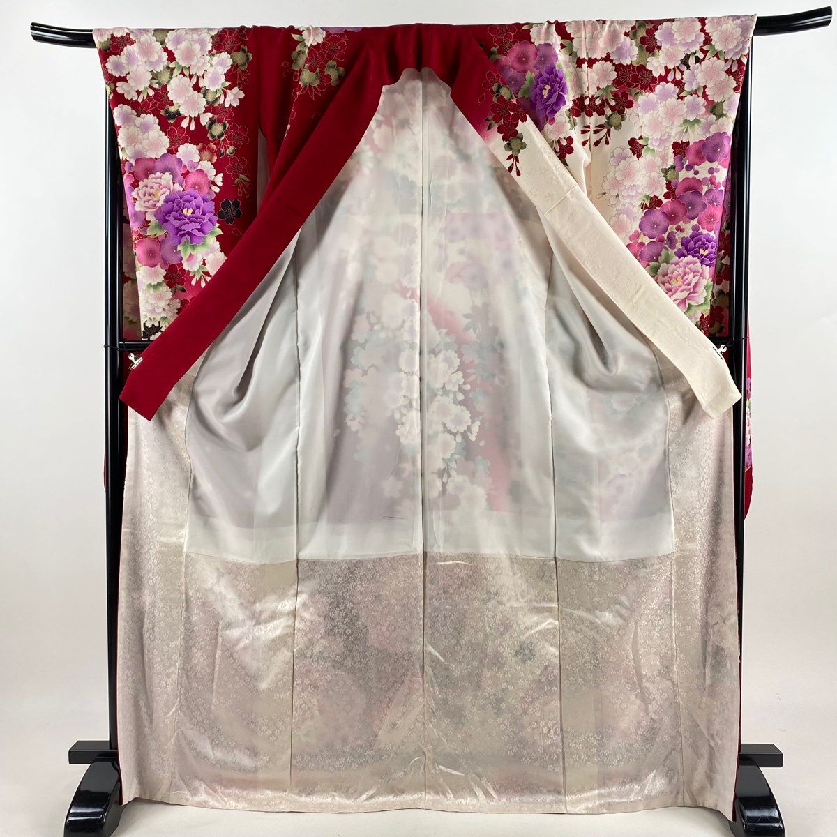 | 振袖 名品 牡丹 桜 刺繍 ラメ 赤 袷 身丈171 裄丈68 L 正絹 【中古】 |