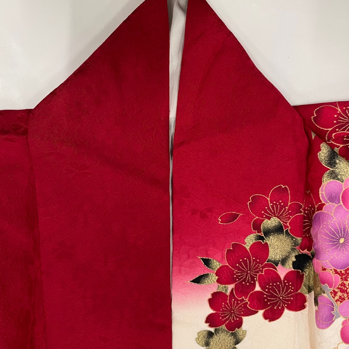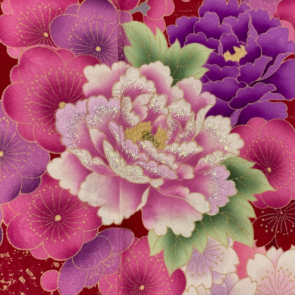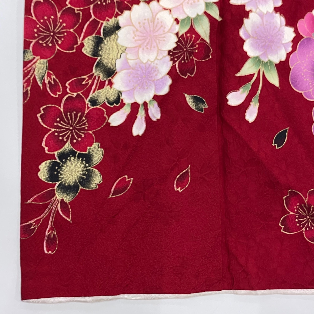 | 振袖 名品 牡丹 桜 刺繍 ラメ 赤 袷 身丈171 裄丈68 L 正絹 【中古】 |