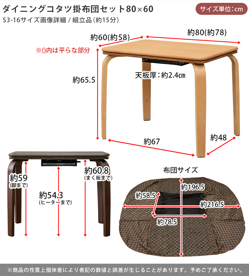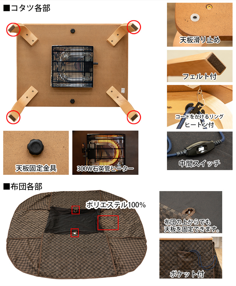 | 材質 | コタツ/天板:合成樹脂化粧繊維板(PVCシート貼り)、フラッシュ構造(芯材ハニカム使用) 幕板:18mmMDF(PU塗装) 脚:積層合板(PU塗装) 300W石英管ヒーター、コード長さ約3m、中間スイッチ 掛け布団:ポリエステル100% |