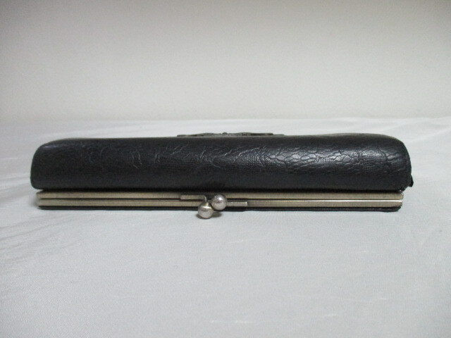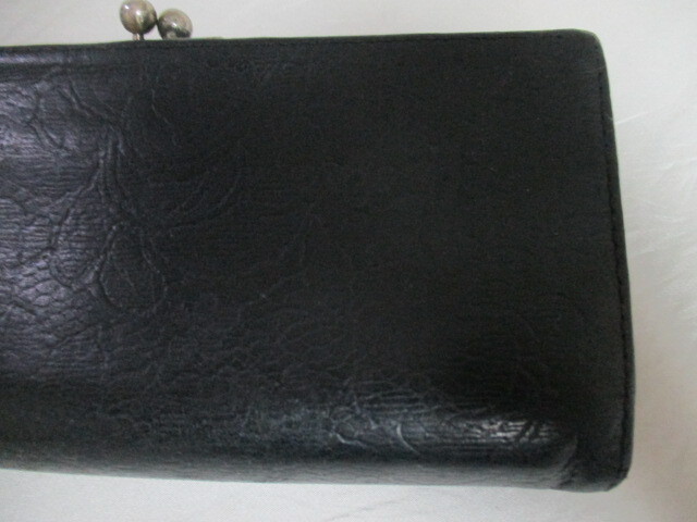| 商品紹介 | 黒の革製長財布です。 全体にバラの型押し模様が入っています。 蓋の部分には楕円と波のような模様のプレートが付いています。 後ろ側にがま口の小銭入れが付いています。 蓋は中央に1個スナップボタンが付いています。 内側は札入れ等2か所、 ファスナー付き小銭入れ1か所、 カード入れ14か所、 その他、スリットポケットが4つ付いています。 裏地はグレーの地色に黒い線でバラの模様が入った 生地が使われています。 *写真白っぽく写っている箇所は光の反射で色抜けではありません。 ※保存袋・箱等の付属品はありません。 (90625) |