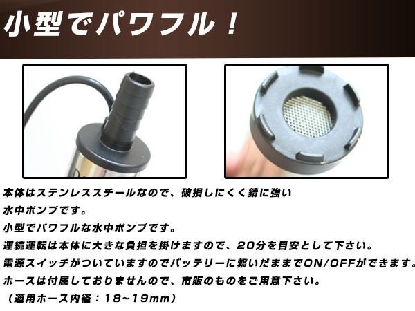 商 品 説 明12V 小型 水中ポンプ 12L/min ケーブル 3m スイッチ式 バッテリー クランプ