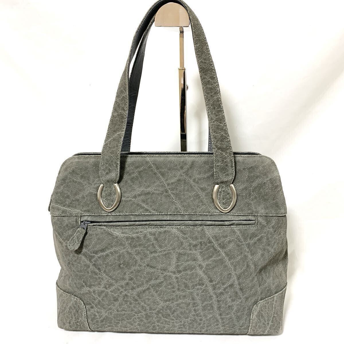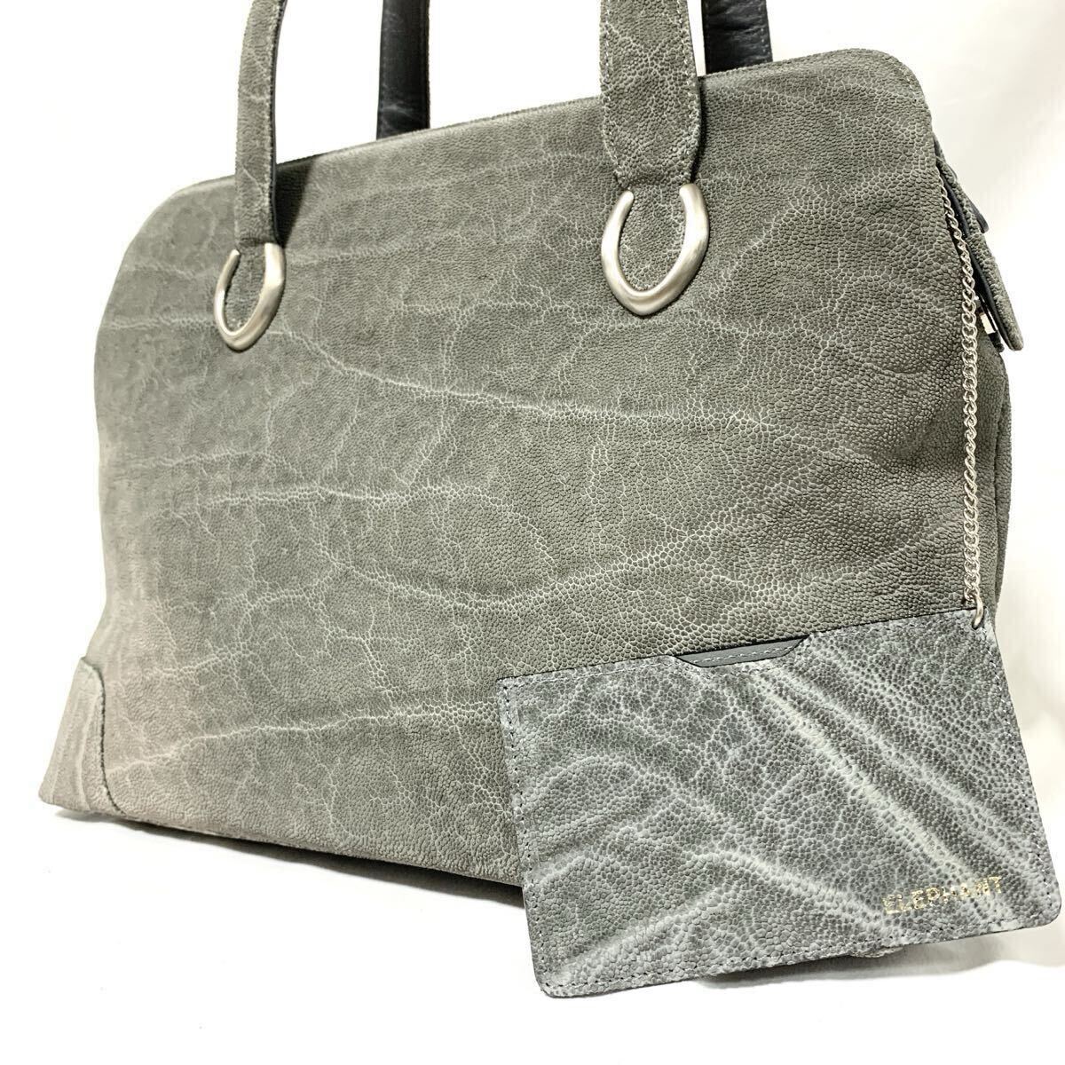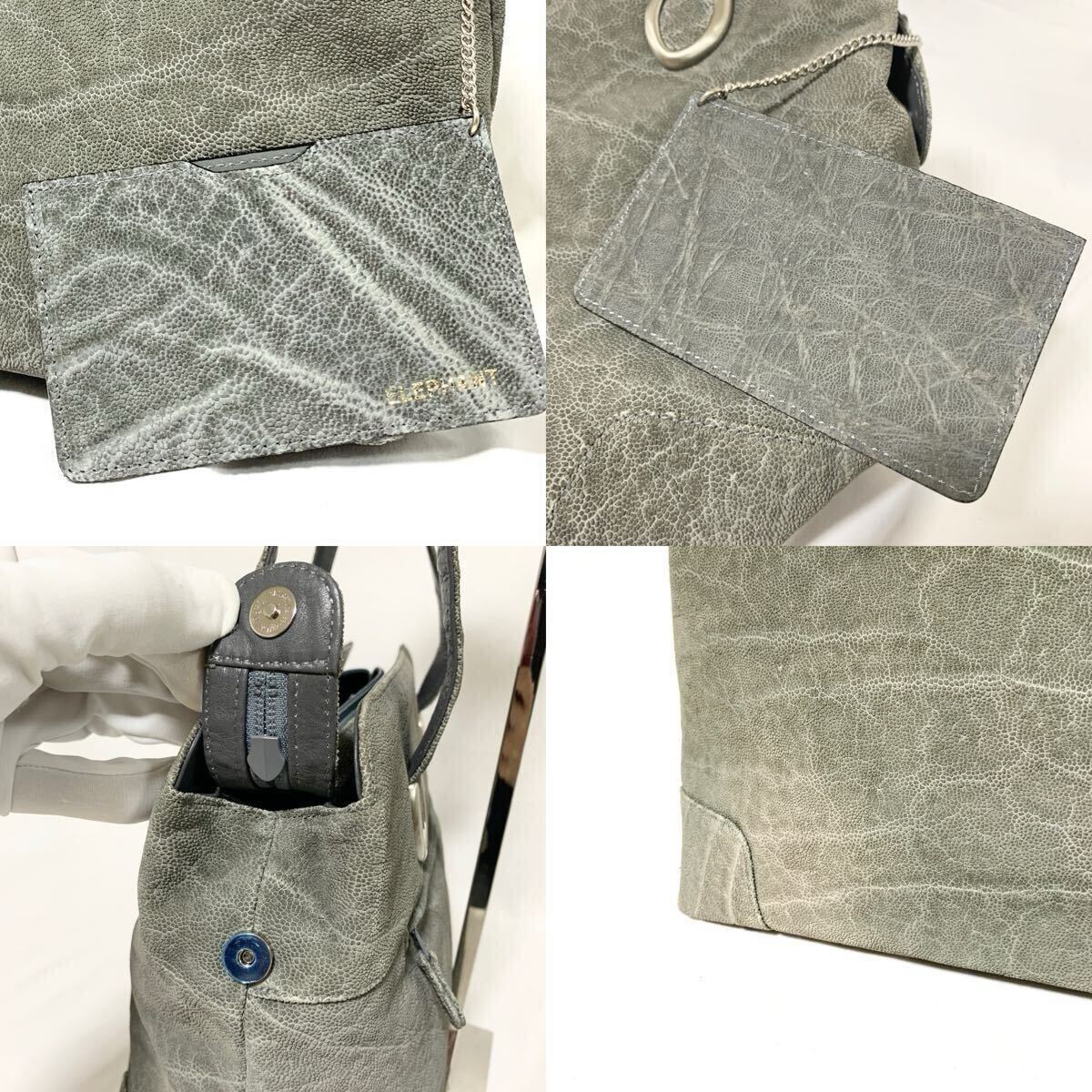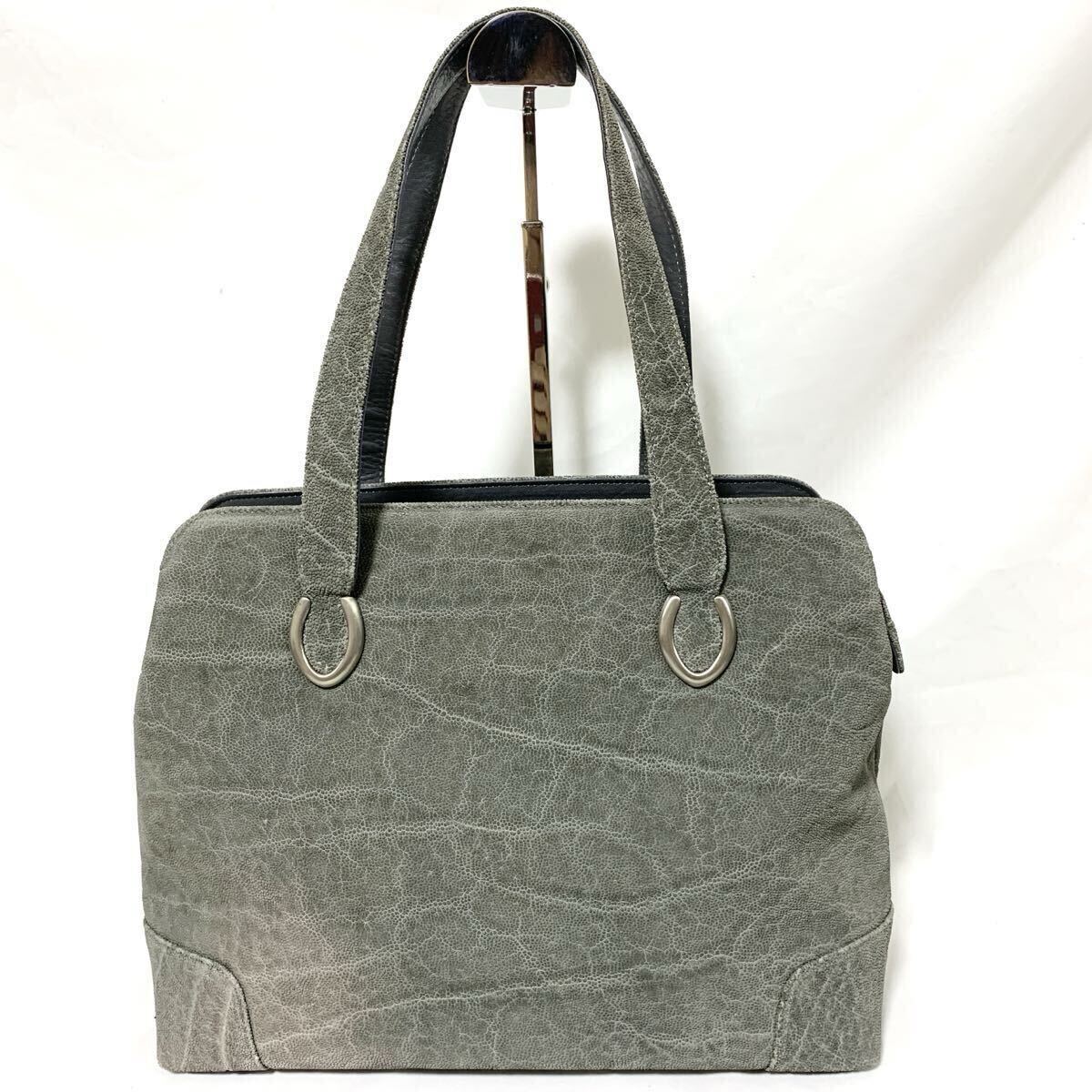 1円 美品 エレファントレザー トートバッグ ハンドバック ゾウ 像革 パスケース付 グレー 灰色 シルバー金具 メンズ レディース 肩掛け可能