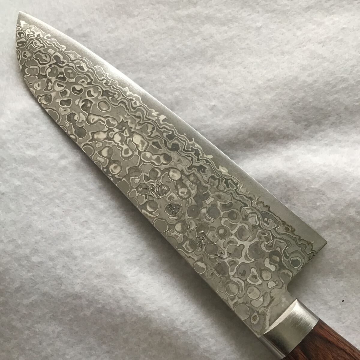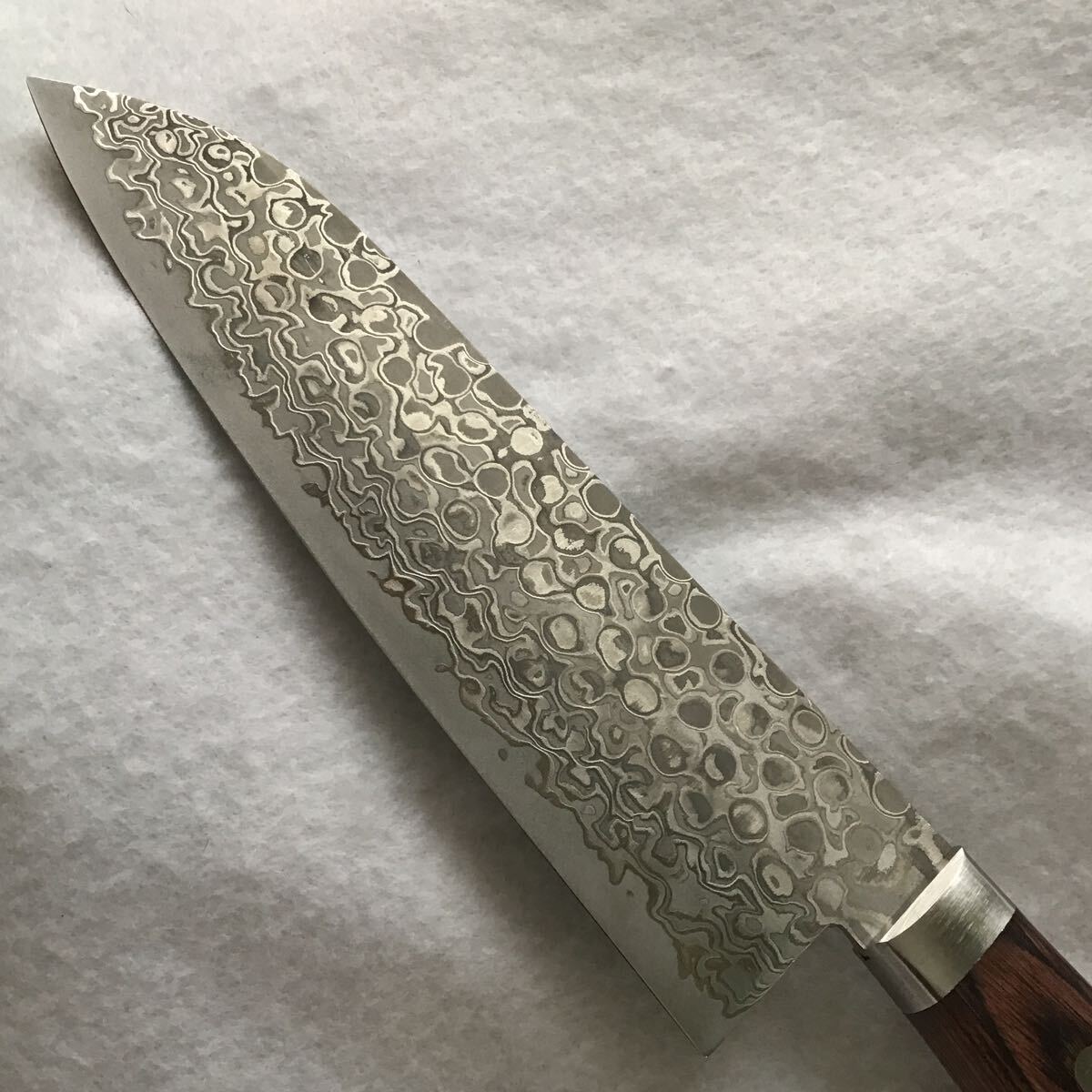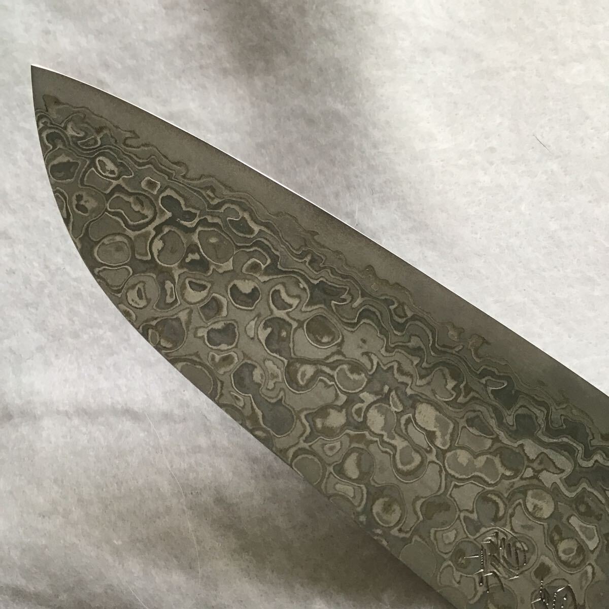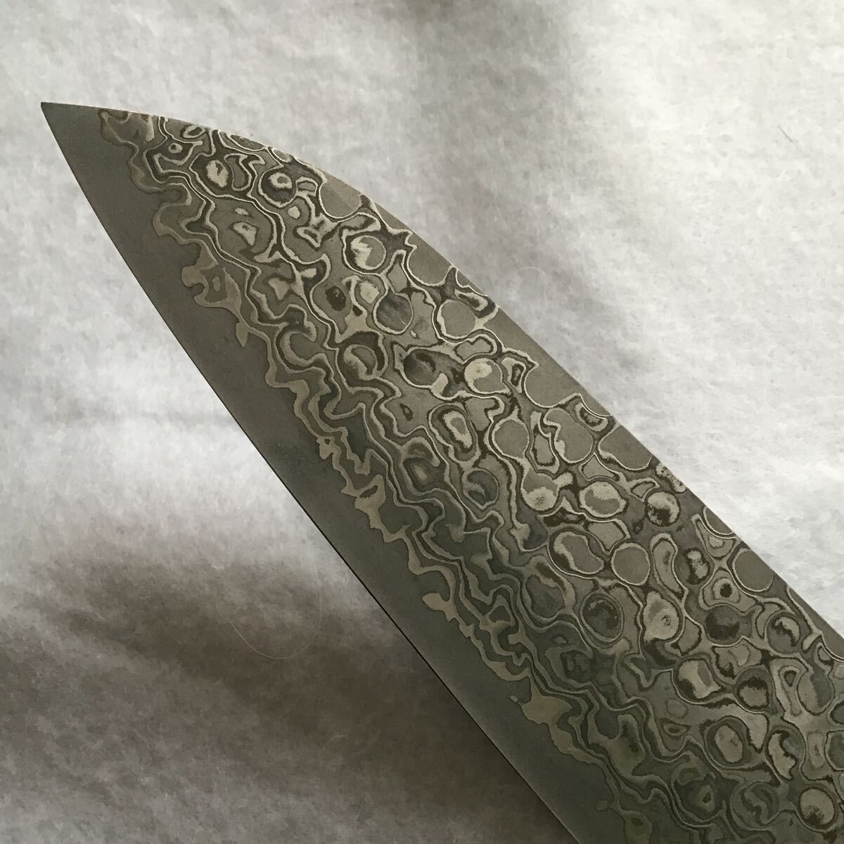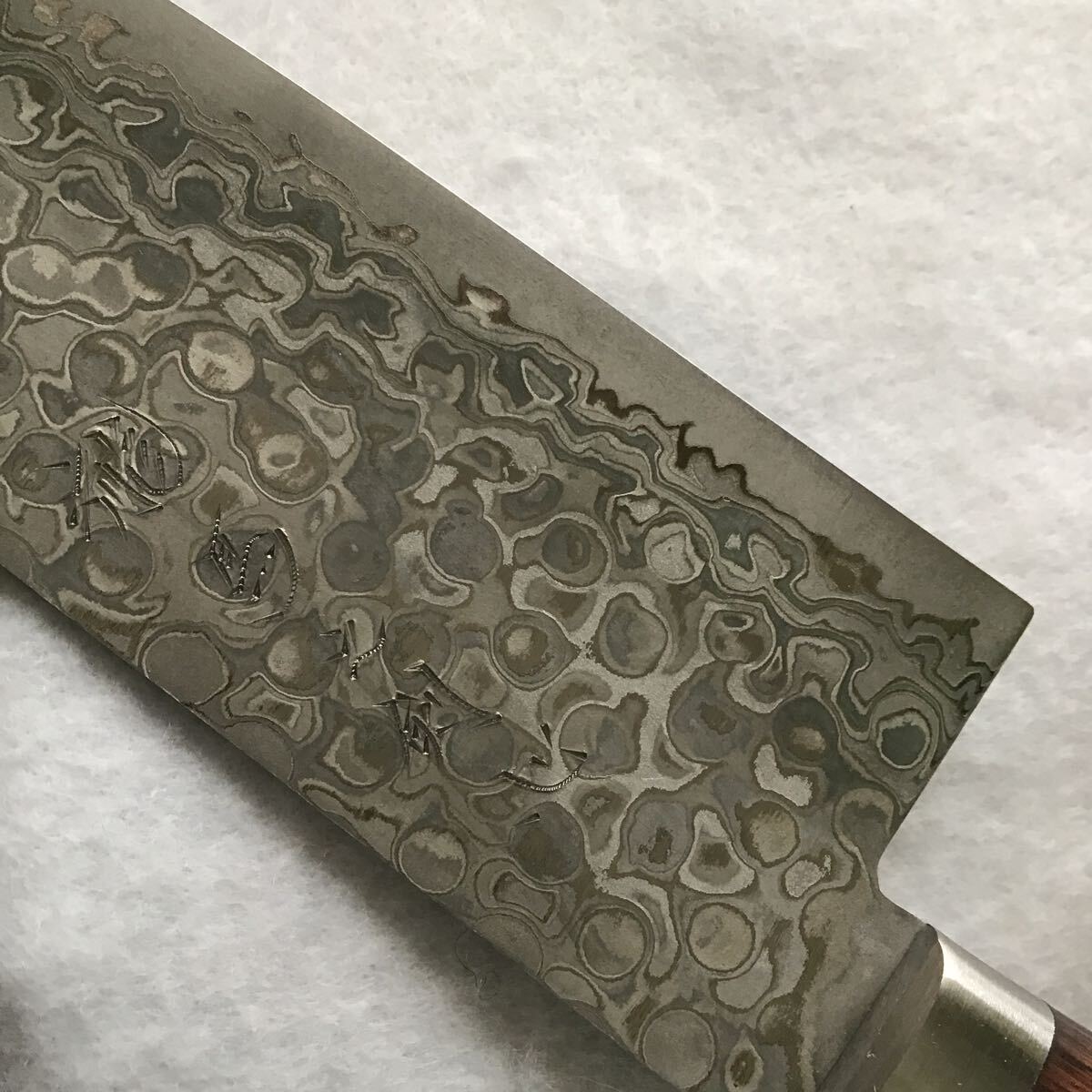 土佐の伝統工芸品である高級打刃物です。 土佐打刃物の特色を活かし、本鍛造・銀三ダマスカス銀染仕上げにて一つひとつ丹念に製造した一品です。 刃先鋼部分は薄墨仕上げとなっております。