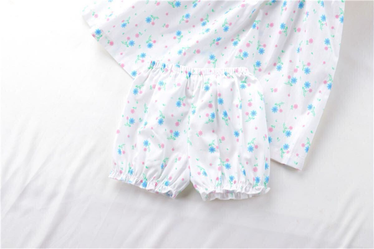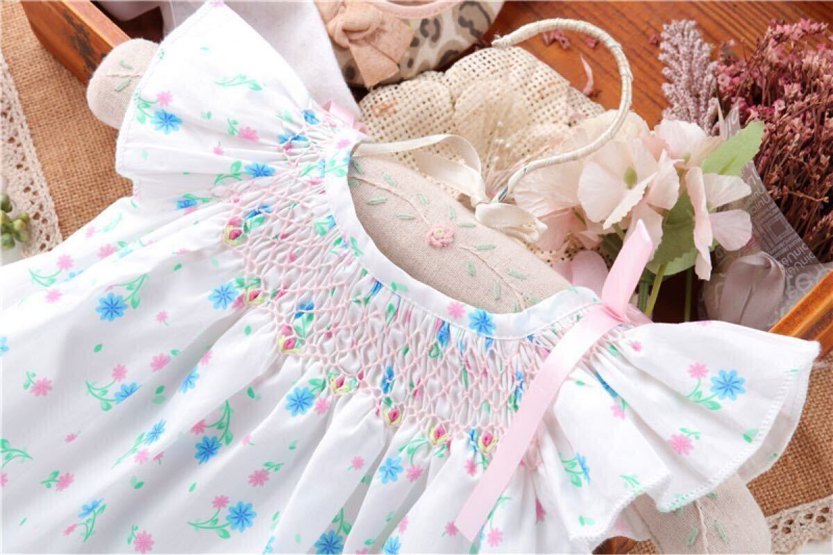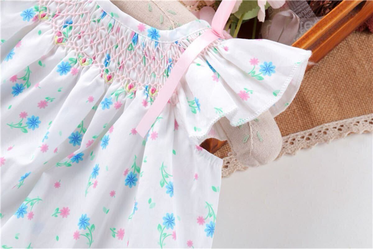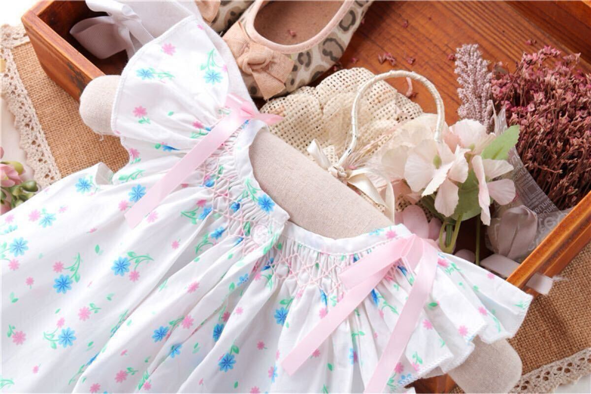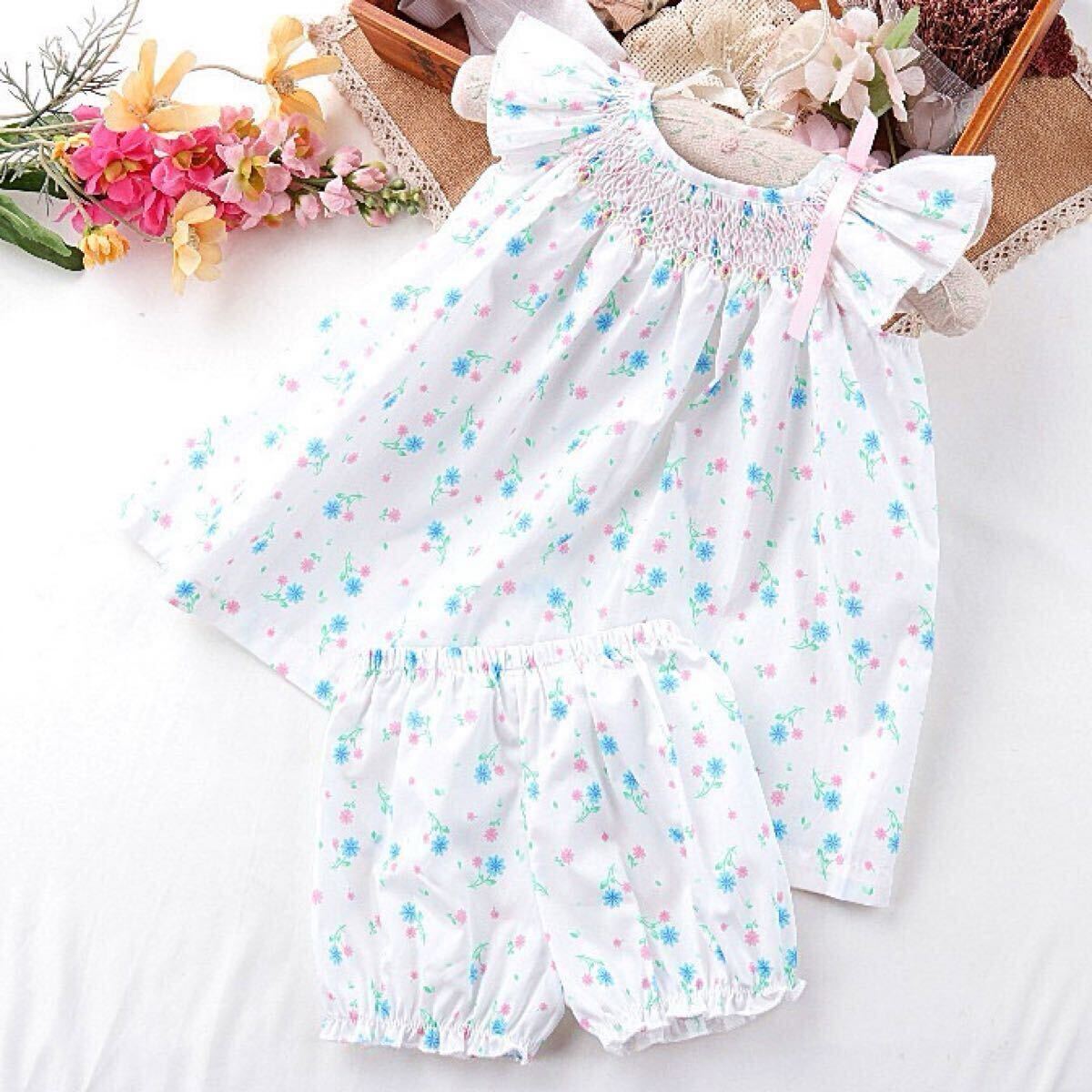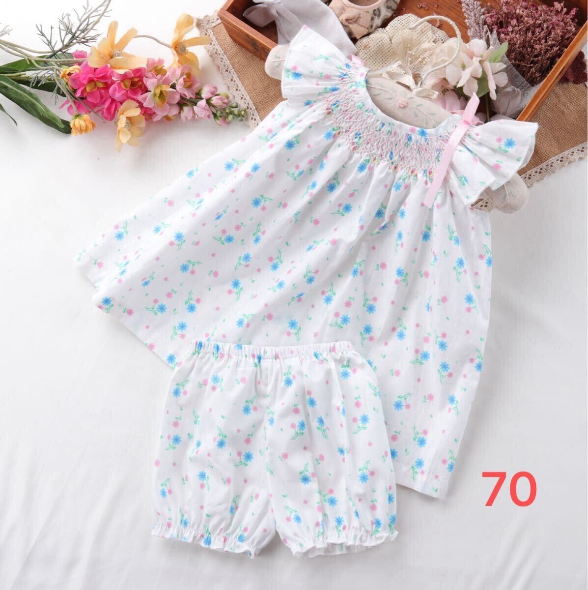 ・柔らかい 小花柄の生地を使用した女の子用スモッキングセットアップ^ ^ ・ゆったりサイズでワンピース、トップスとして使い頂けます! ・胸元の豪華なスモッキング刺繍は職人により一枚一枚施されました。