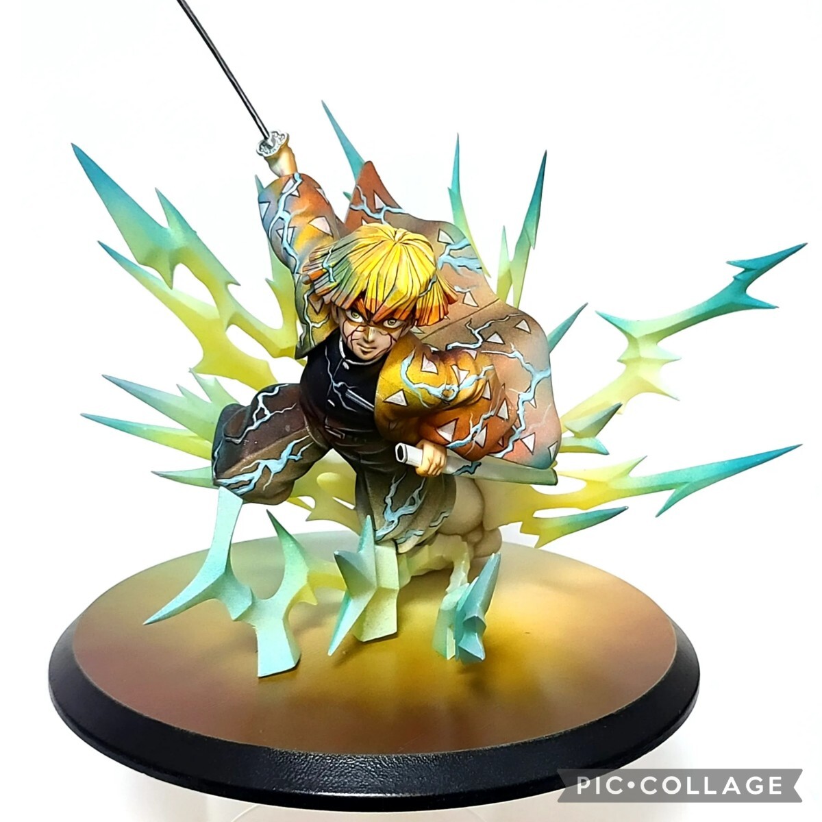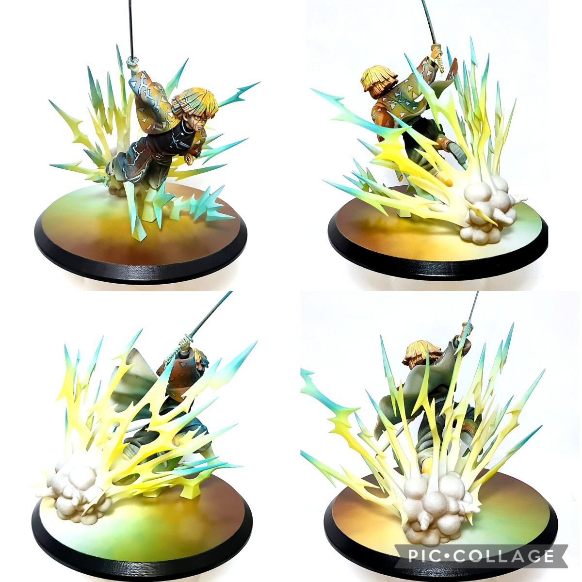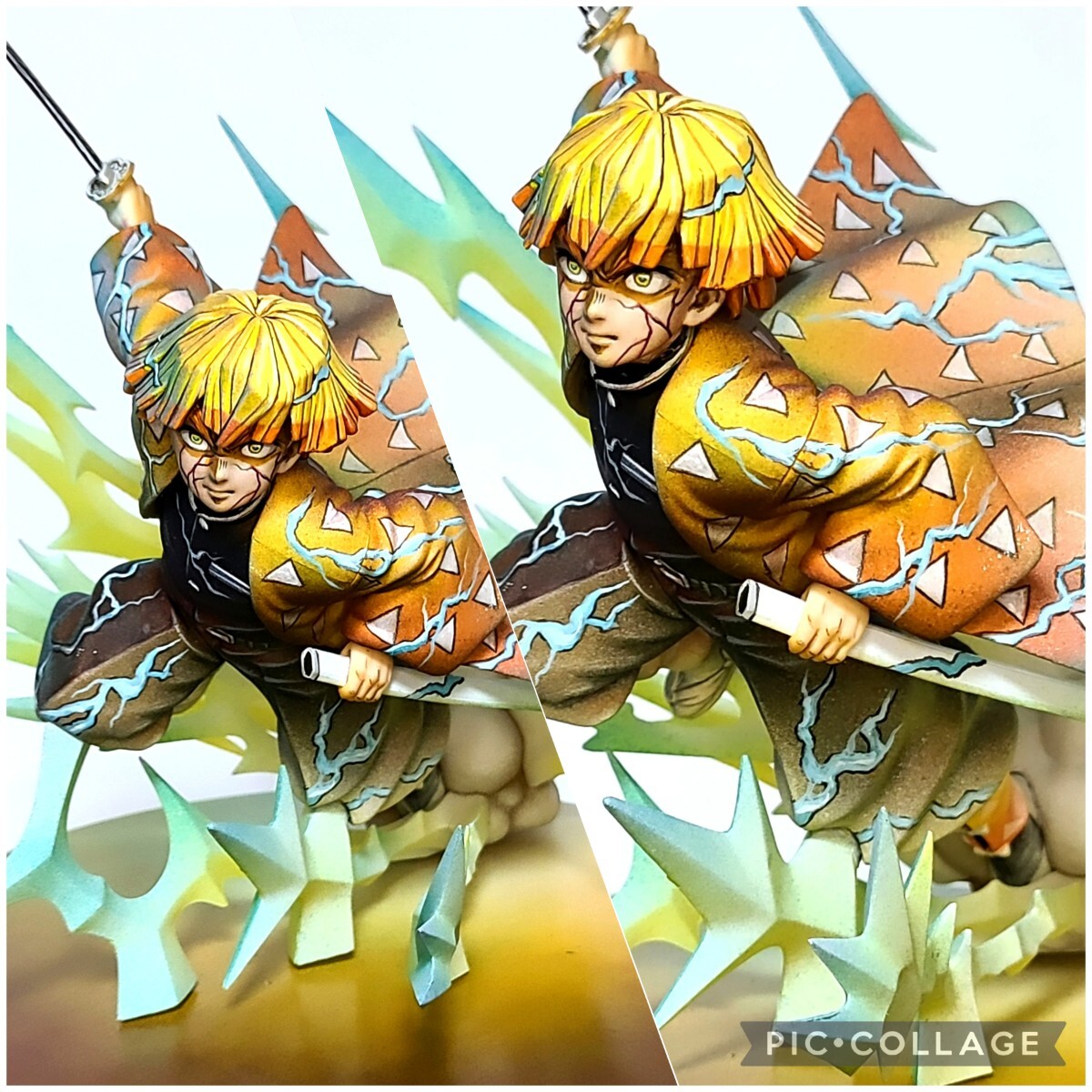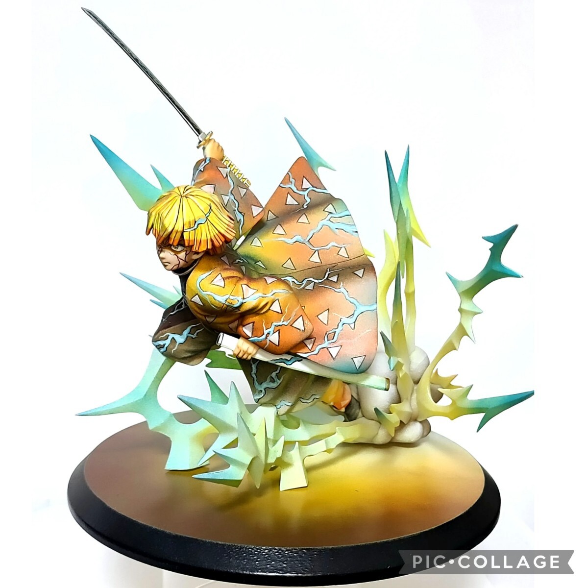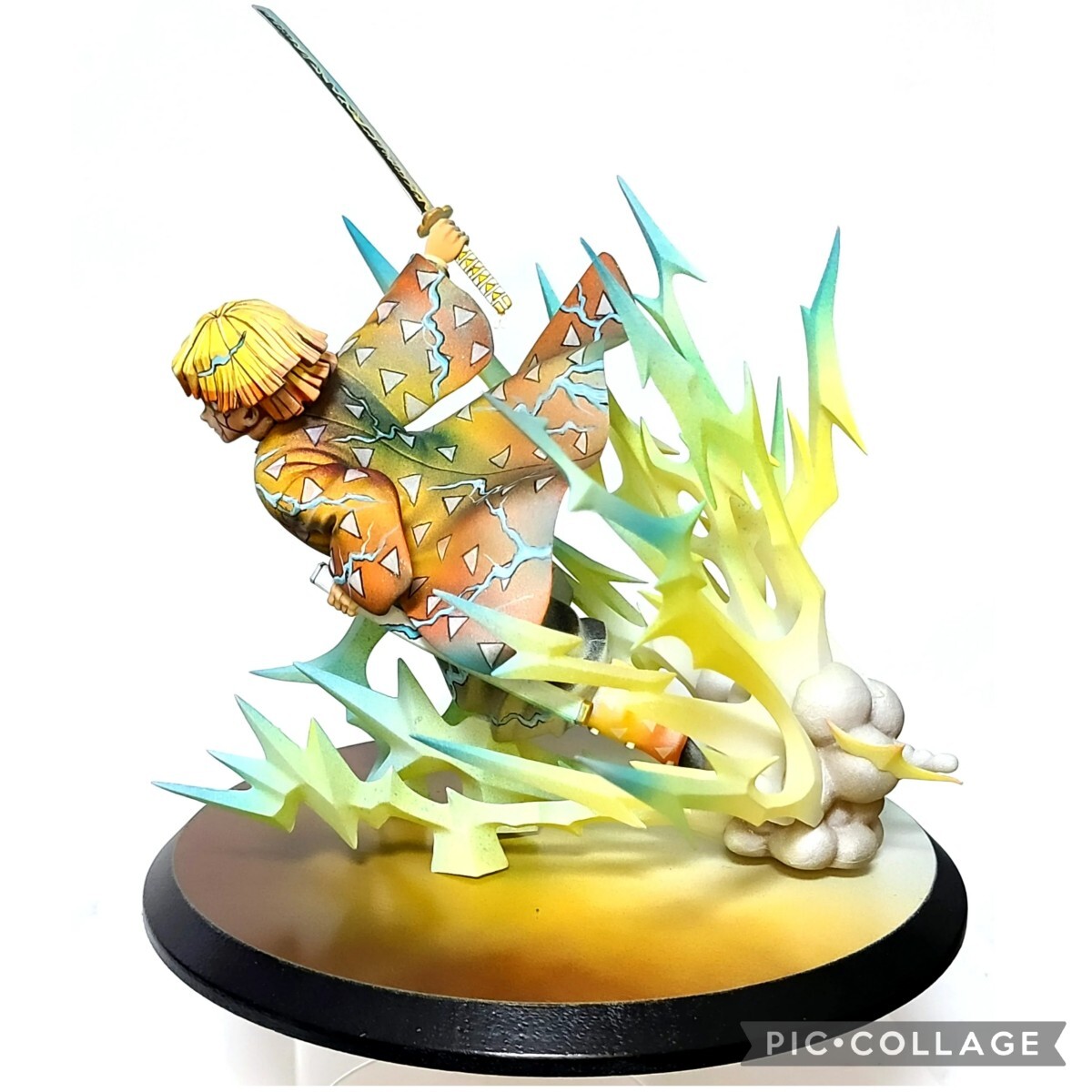 使用状況 :フィギュアーツZEROの我妻善逸をイラスト風にペイントした完成品となります。顔を描き直してエフェクトを描き足しました。木製の台座を用意しましたので展示の際にお好みでお使いください。
