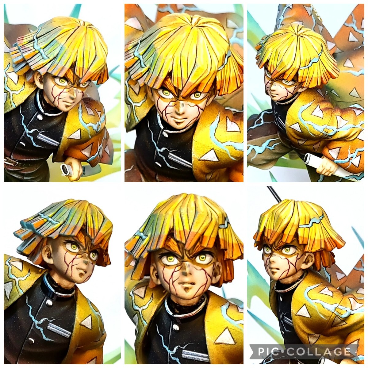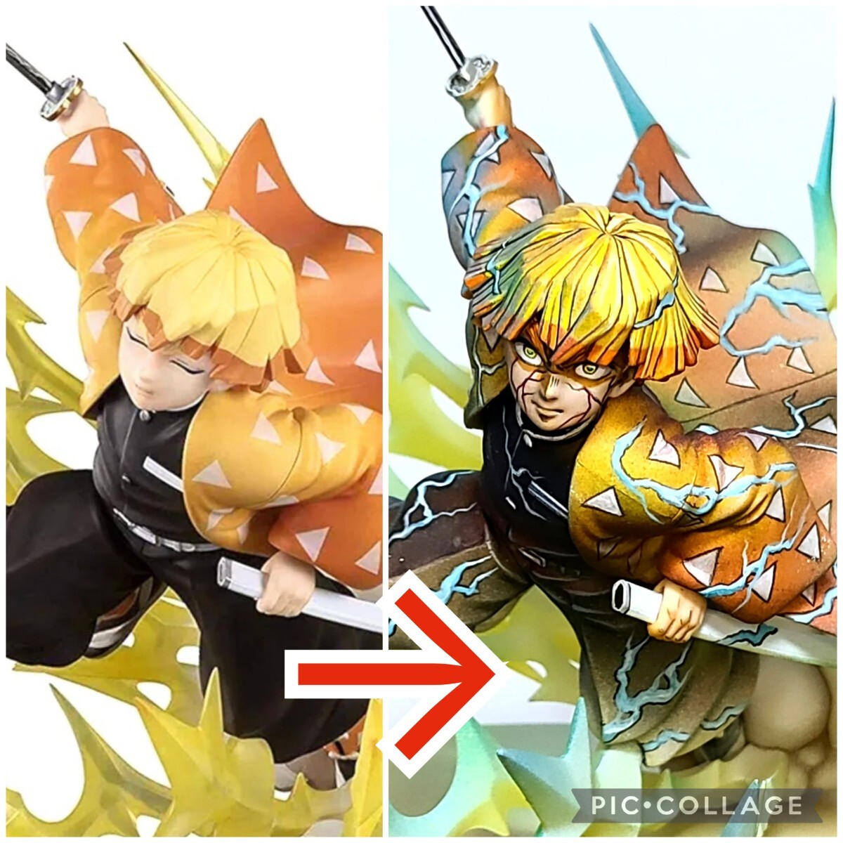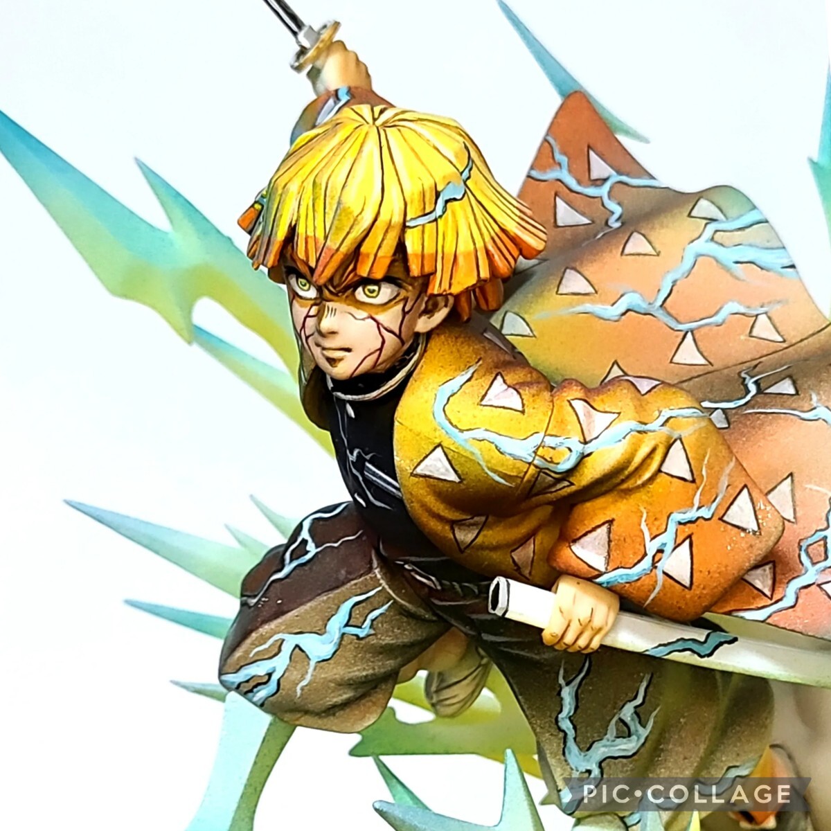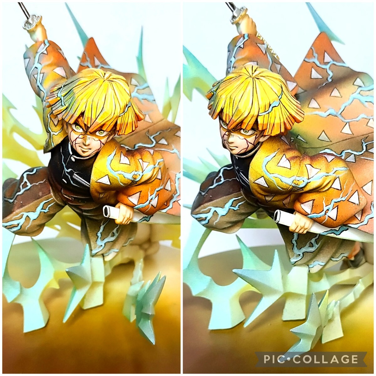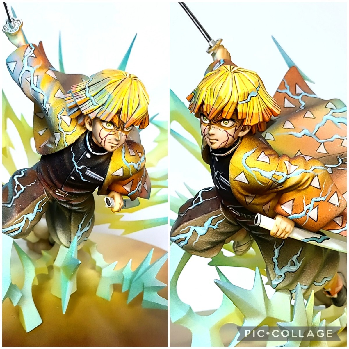 使用状況 :フィギュアーツZEROの我妻善逸をイラスト風にペイントした完成品となります。顔を描き直してエフェクトを描き足しました。木製の台座を用意しましたので展示の際にお好みでお使いください。