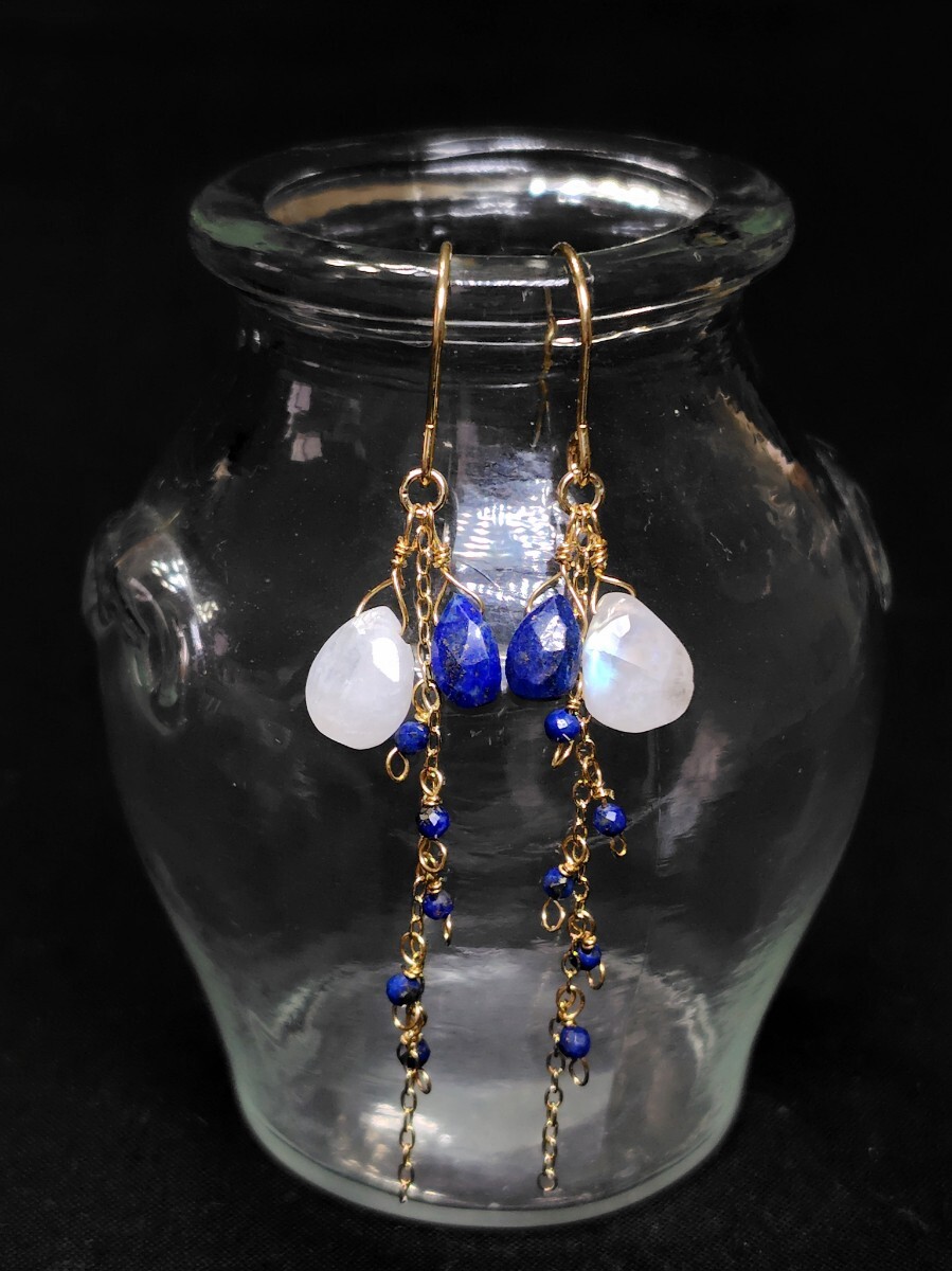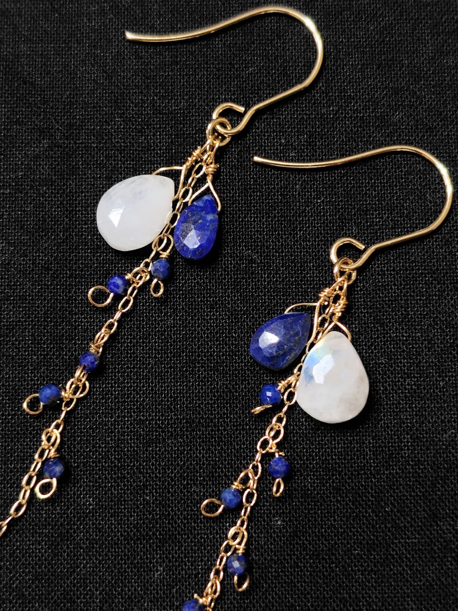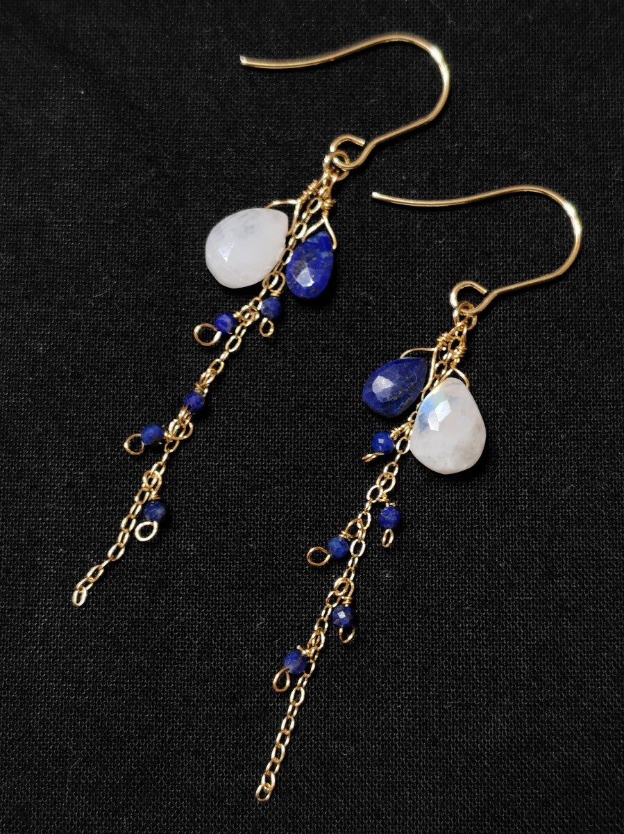 (材料)ブルームーンストーン(ペアシェイプカット型)8、5×6mm、ラピスラズリ(ペアシェイプカット・ラウンドカット型)6、5〜6×4・1、5mm、ピアスフックはサージカルステンレス、ワイヤーは真鍮、チェーンはメッキ(ゴールドカラー)