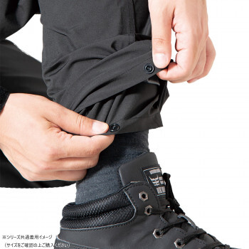 レインスーツの上下セットです。フードはヘルメットに対応しており、未使用時等はフード固定タブで収納できます。また、左右の動きだけでなく上下の動きにも連動する新設計フードで、視界を遮らず、様々なシーンで安全性と快適性を向上させます。股下の長さは最大約10cm調節可能です。 |