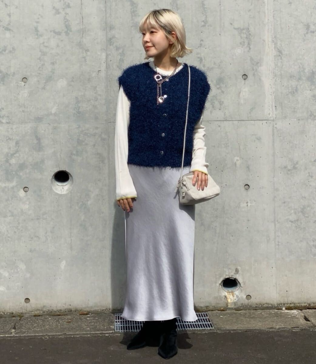 オーバーサイズのニットや、ベストと合わせたトレンド感溢れるコーディネートもおすすめ。