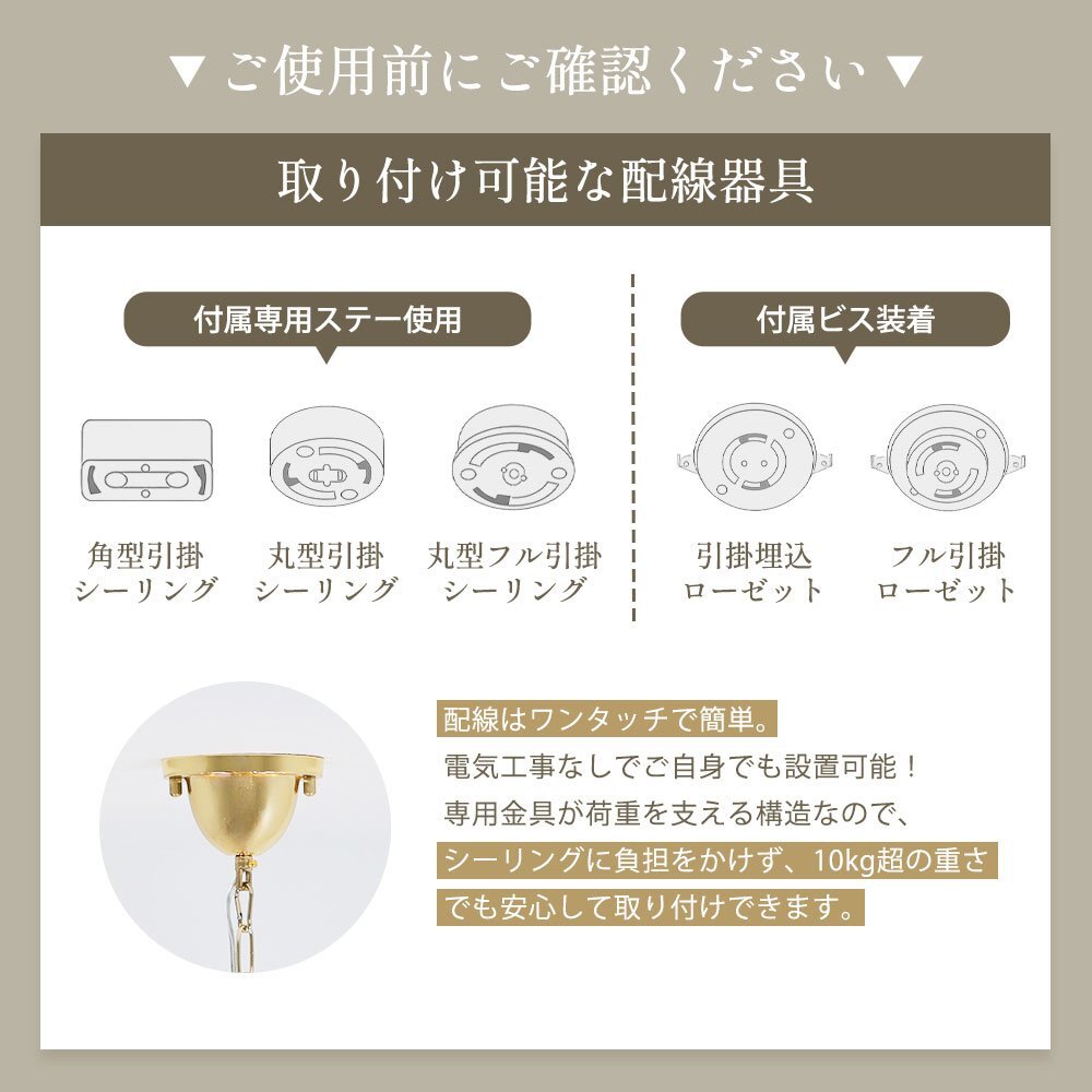 注意事項 | 新品・未使用品での販売ですが製造上での多少の小傷等はご了承願います 取り付けに関しましてはワンタッチでは御座いませんが(配線はワンタッチ)引掛けシーリングに対応しております、取り付け説明を参考に組み立て・結線して下さい、ご心配の場合は安全を期して最寄の電気工事店にご依頼をお勧めいたします また取り付け方等事前にお知りになりたい方はお気軽に質問コーナー又はfirst@kuk.ne.jpにお問い合わせお願い致します ※調光ご希望の場合、調光対応LED1個¥200-アップと汎用調光器(Panasonic製LED用調光器推奨)が必要です 調光不可LED電球使用時、壁スイッチが調光スイッチ又はホタルスイッチの場合はLED不具合の原因になりますのでON/OFFのみのスイッチでご使用願います 店頭販売もしており重複した場合キャンセルさせていただく場合がございますがあらかじめご了承願います |