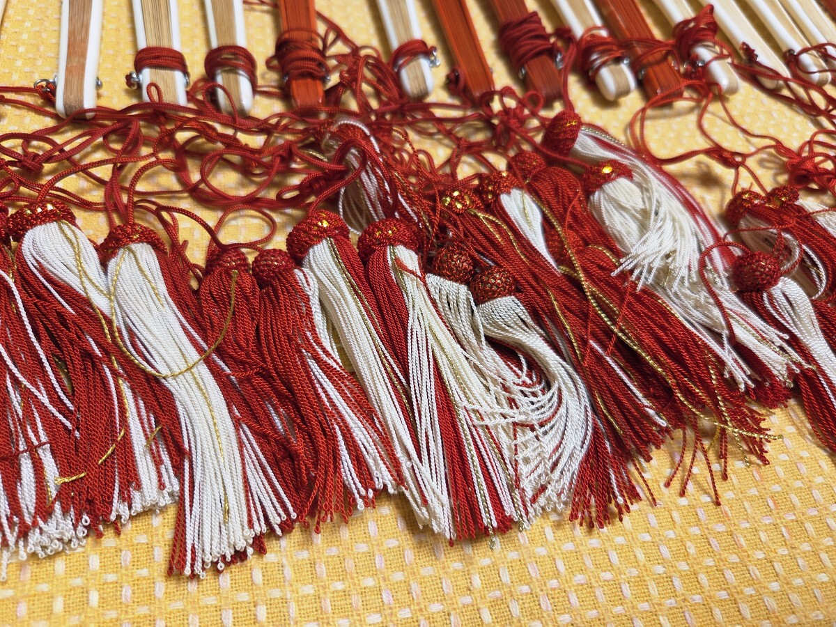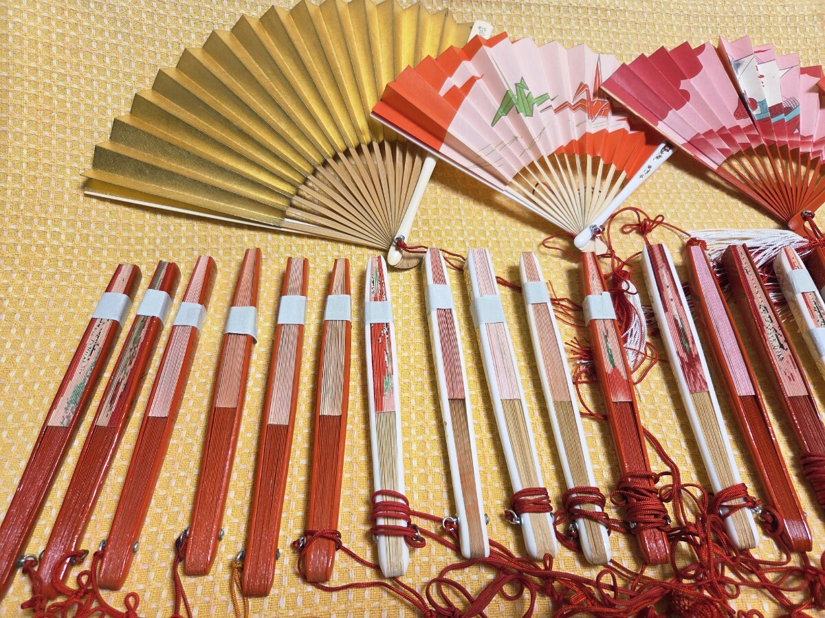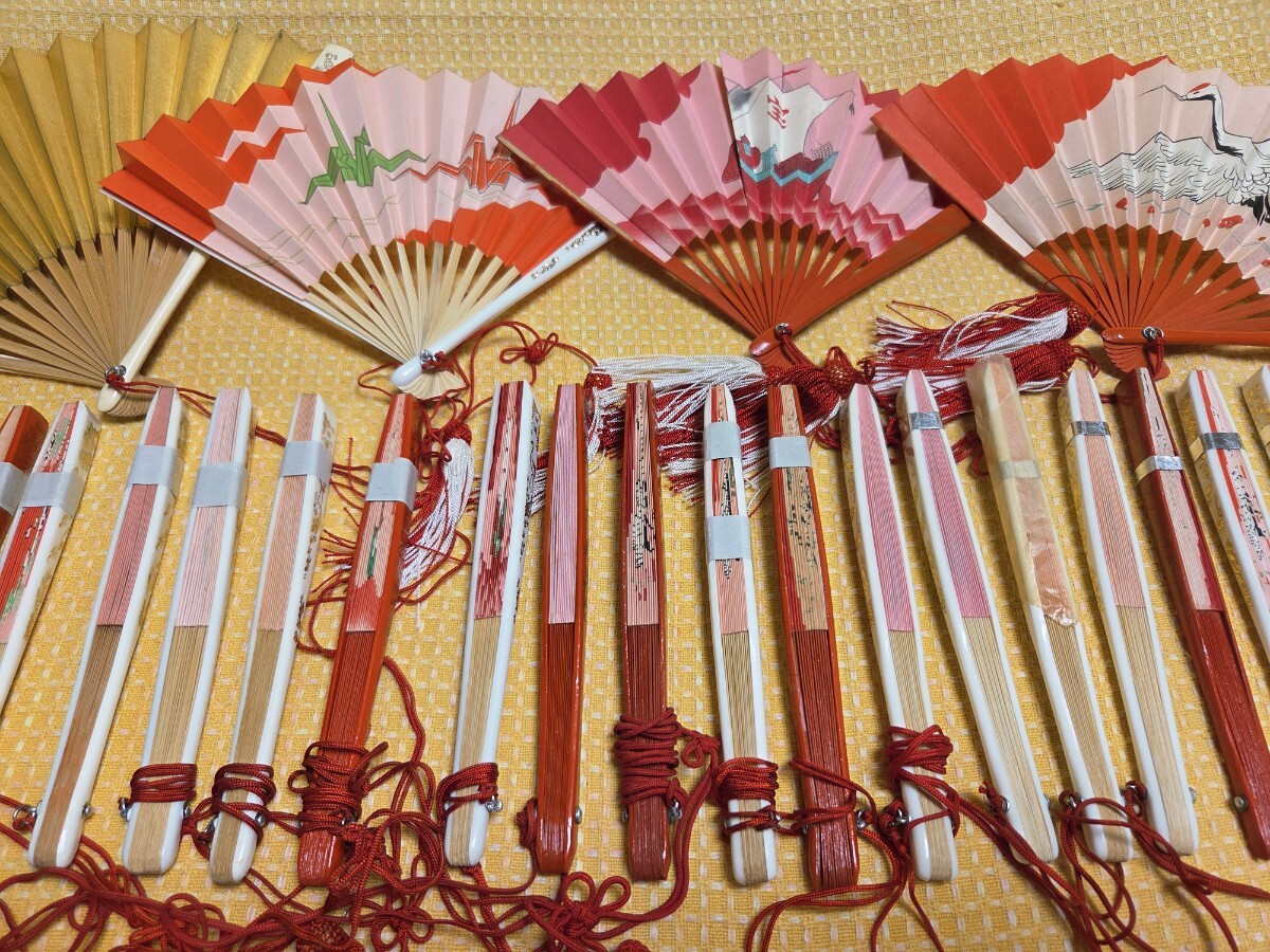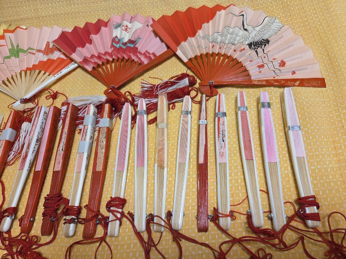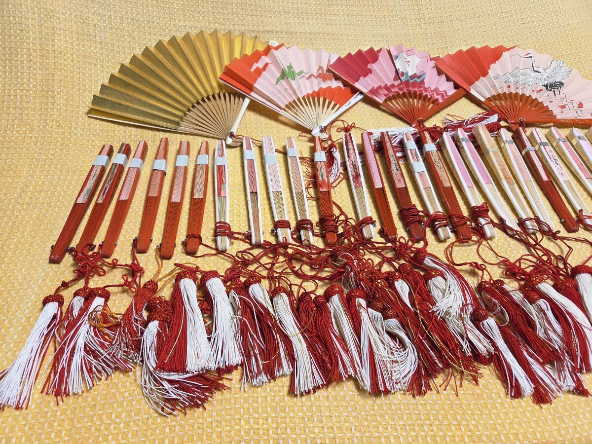 タグがついたまま開いてないものも多数ございます。 ざっと見たところ扇子は非常に綺麗です。 房にくすみを感じるものがあります。普通の七五三用の扇子のサイズと考えてください。色やデザインなどは画像をご覧ください。ご理解のいただける方のご入札をお待ちいたしております。