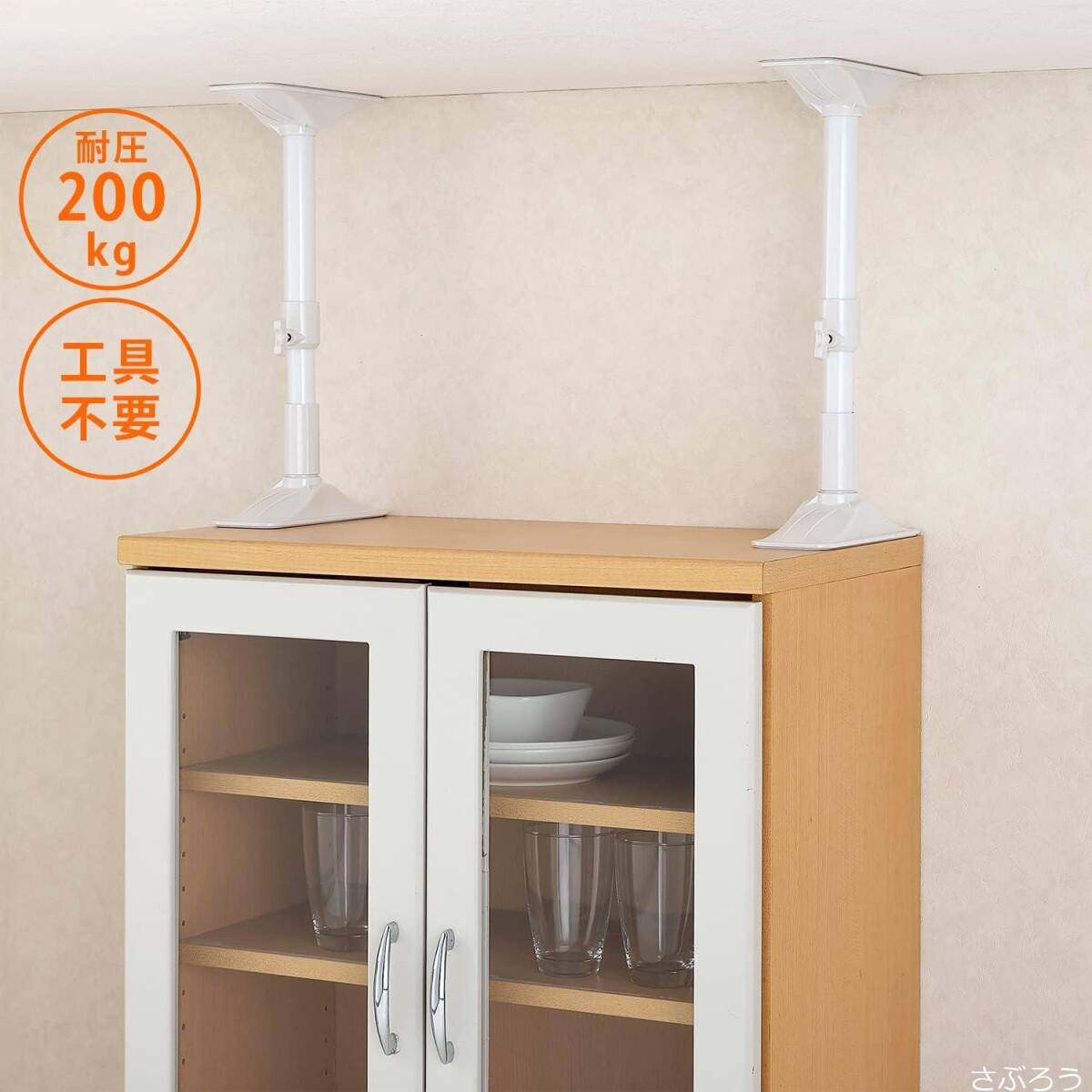 家具の転倒を防止し、万一の地震時に被害を軽減する防災用品。天井と家具のすき間を強力に圧着固定。耐圧201kgを実現。(公的機関による圧縮試験結果による)