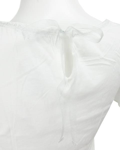 コメント | 上品でおしゃれなカットソー。 光沢のあるシアーのリボンを後ろで結んでいただくデザイン。 胸元のビジューがおしゃれです。 カジュアルシーンやオフの日などでおすすめです。 |
