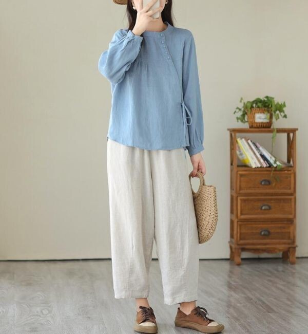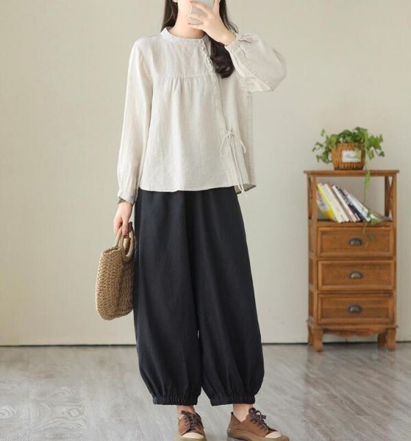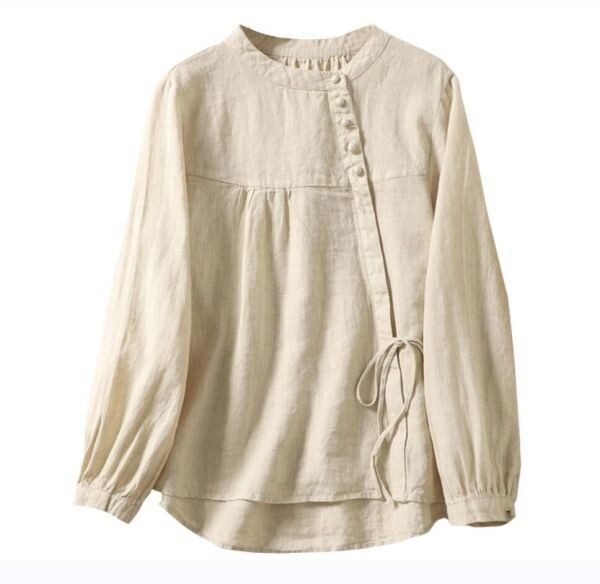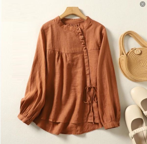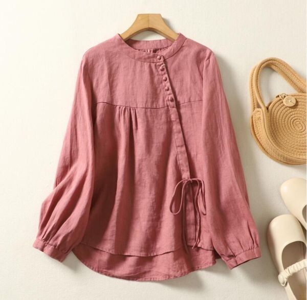 新品 秋 冬 M-2XLカジュアル チュニック ゆったり 無地 綿麻 着痩せ 長袖 ブラウス トップス 大きいサイズ きれいめ麻色