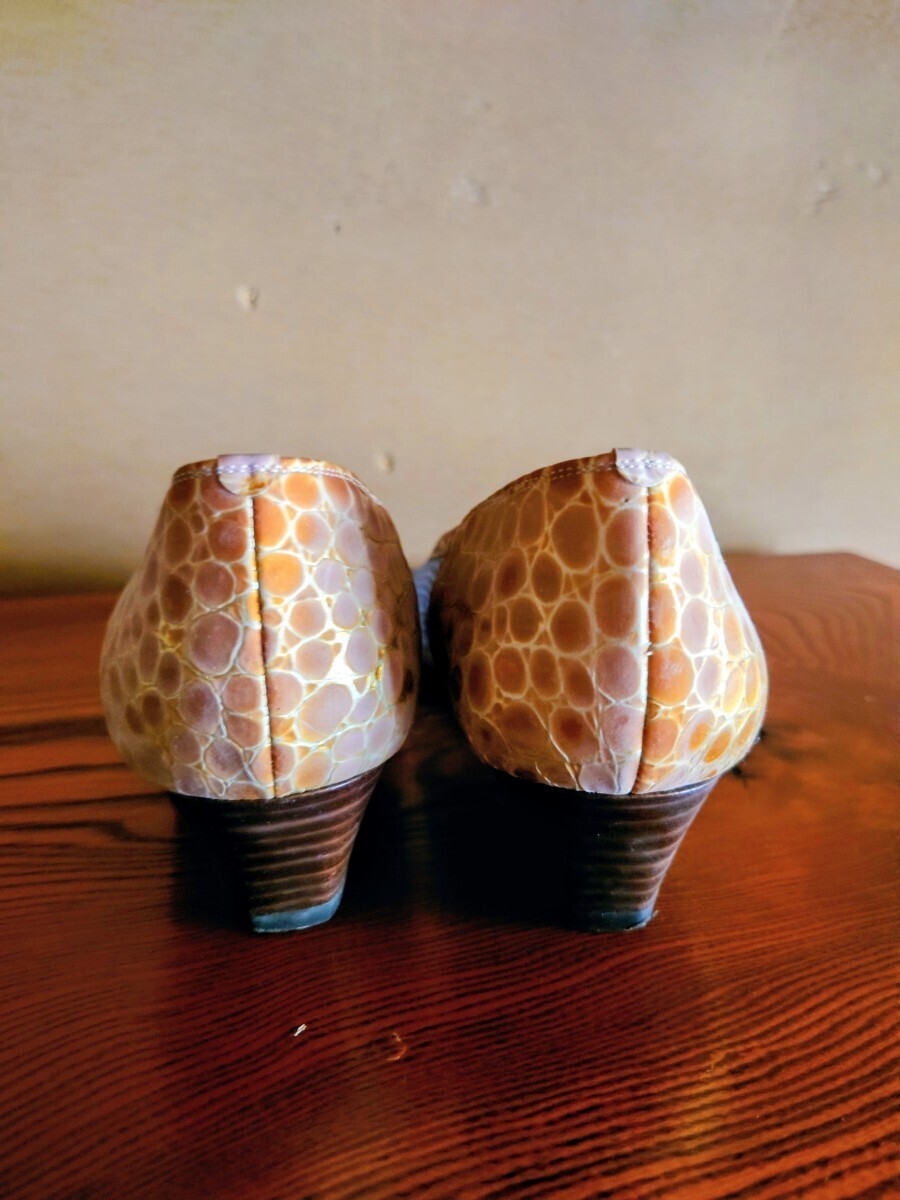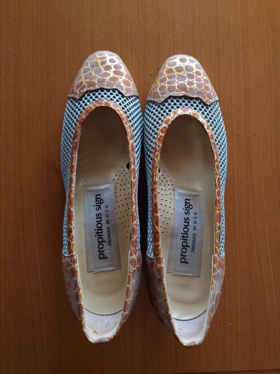 【美品】網メッシュ高級牛革レザー型押しデザイン 24cm EEE ローヒールパンプス 日本製 ブルーグレー型押しゴールド金茶 日本製