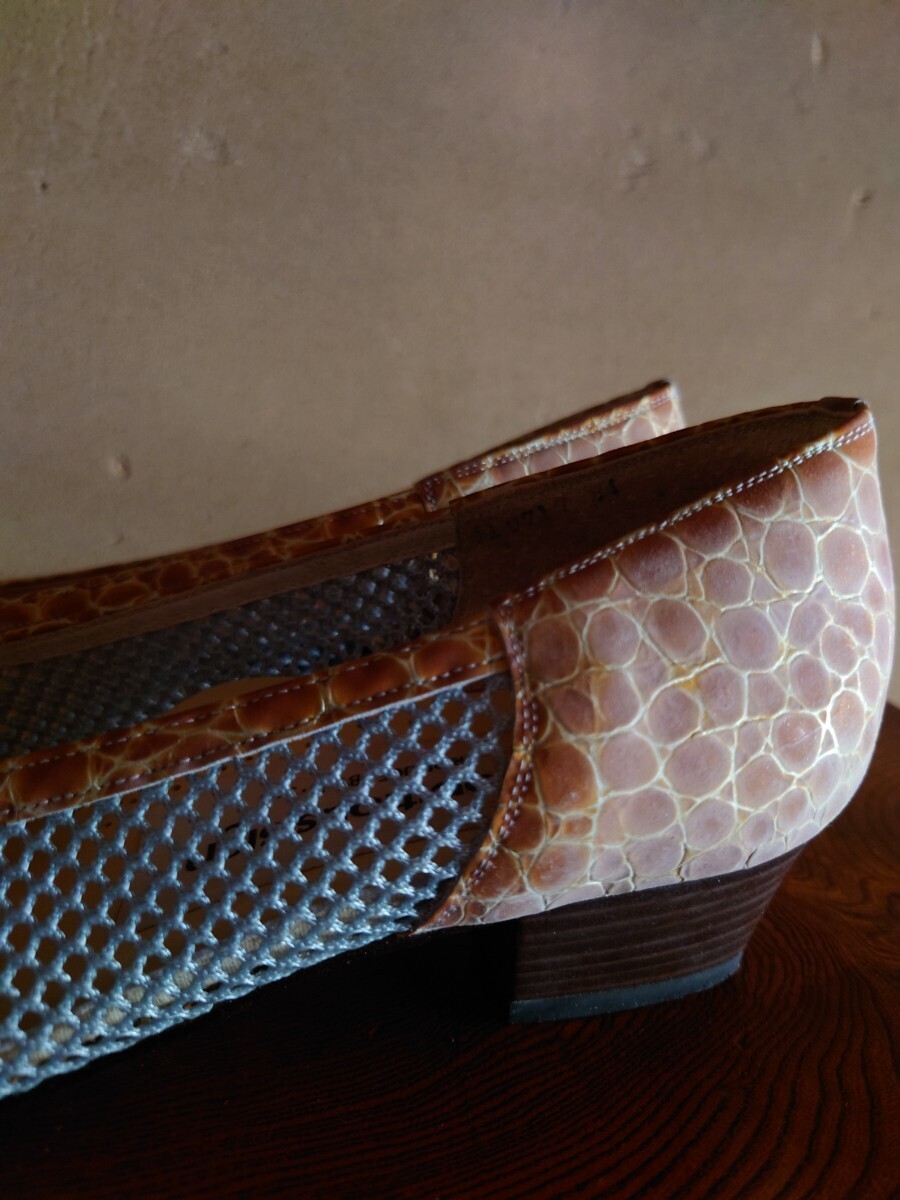 【美品】網メッシュ高級牛革レザー型押しデザイン 24cm EEE ローヒールパンプス 日本製 ブルーグレー型押部ゴールド金茶 日本製