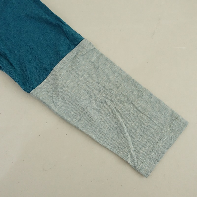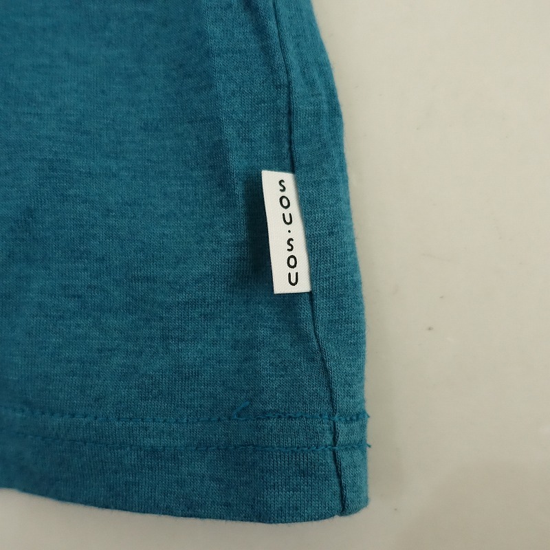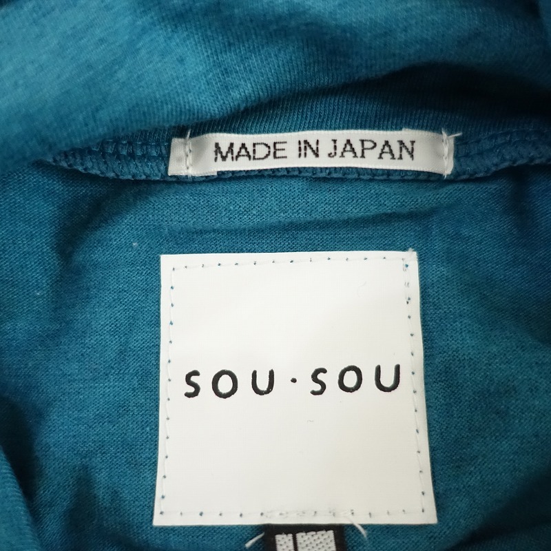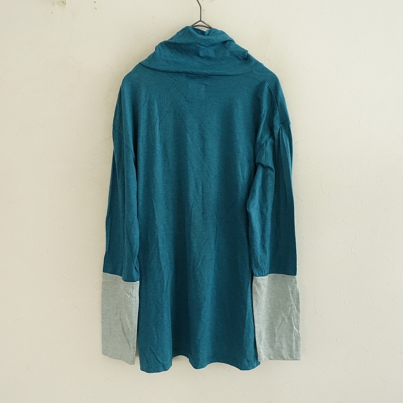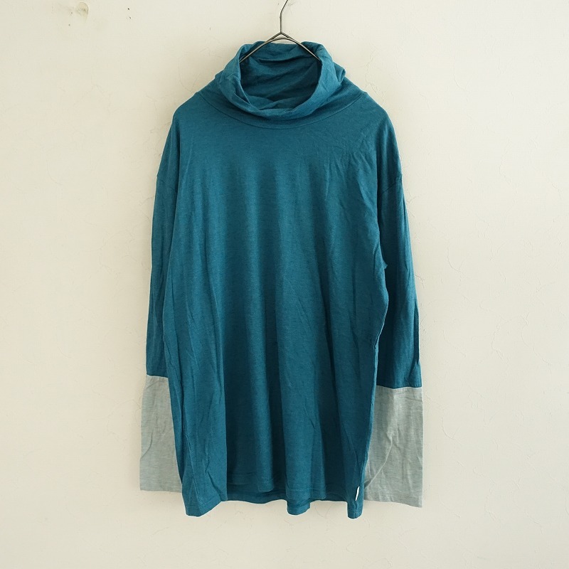 SOU SOUのバイカラータートルネックプルオーバーです。カラーはブルーグリーン×袖口は杢グリーングレーの切り替えで、綿×毛混紡の天竺のような薄手のニット地です。プルオーバータイプで着脱できます。 |