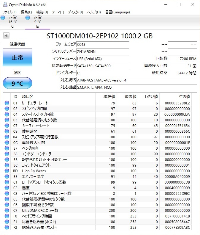 ・当方の環境でCystalDiskInfoを使用し正常判定でした。