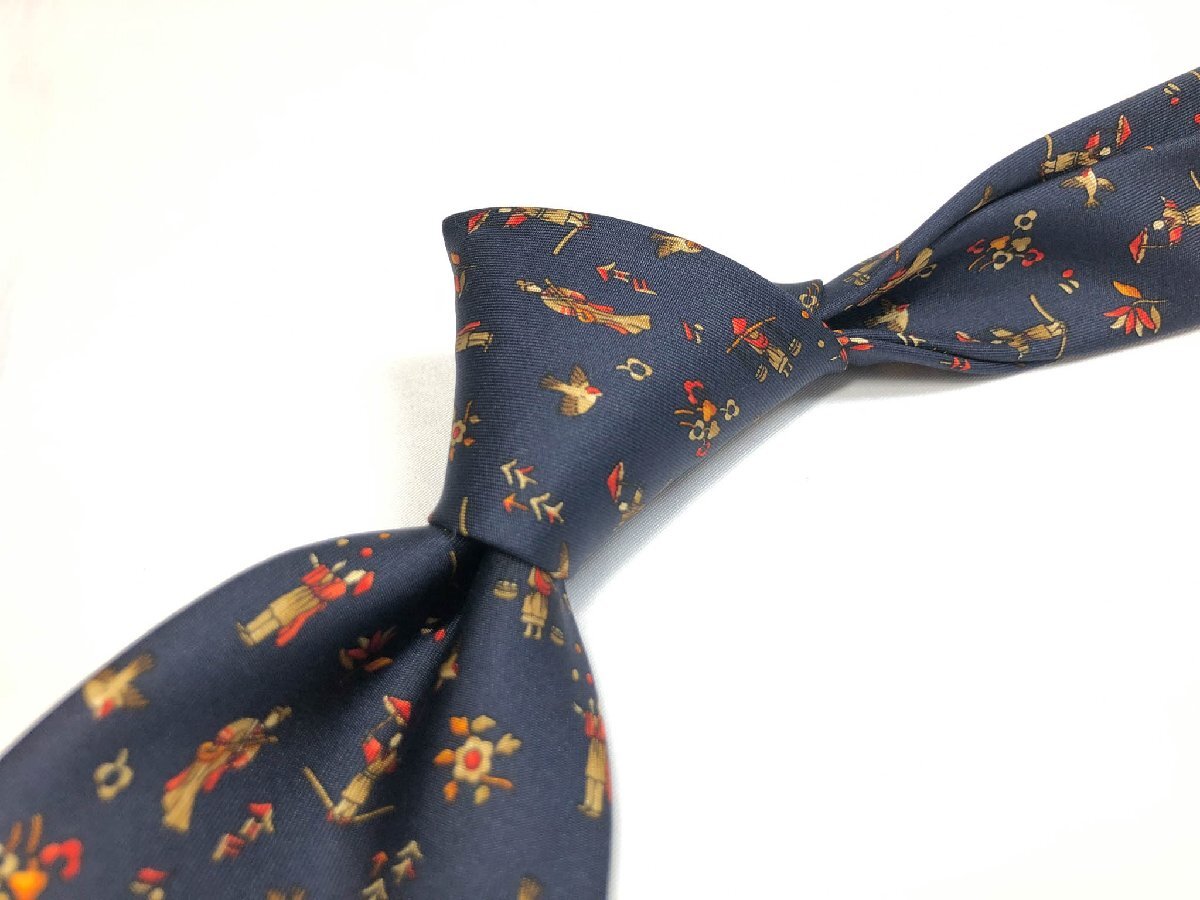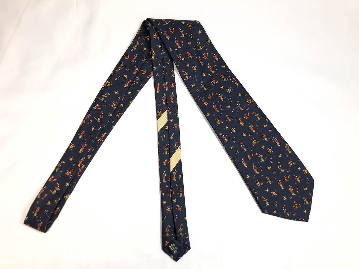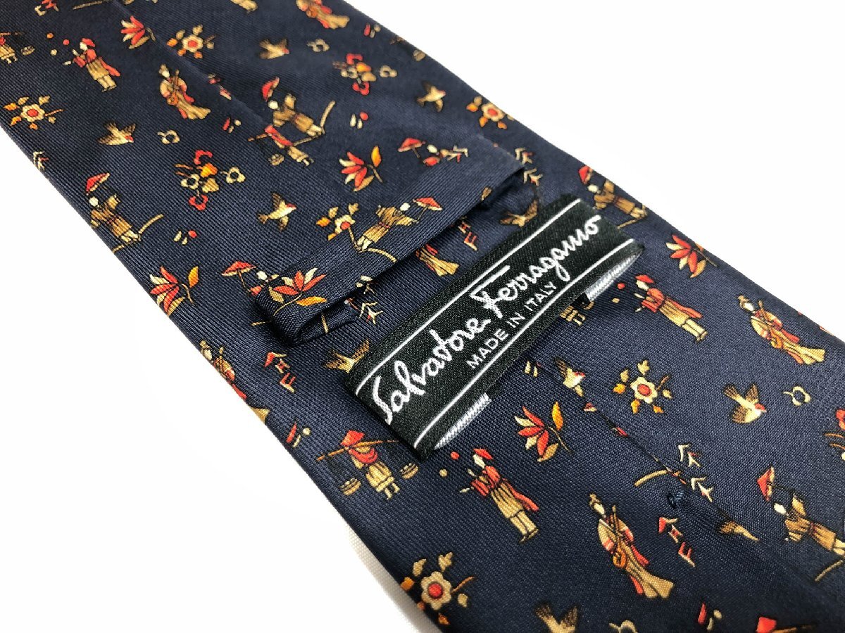 超美品【Salvatore Ferragamo サルヴァトーレフェラガモ 】素敵なプリント柄♪ シルク ネクタイ(メンズ)濃いめのネイビー系 伊製◇17MM8714
