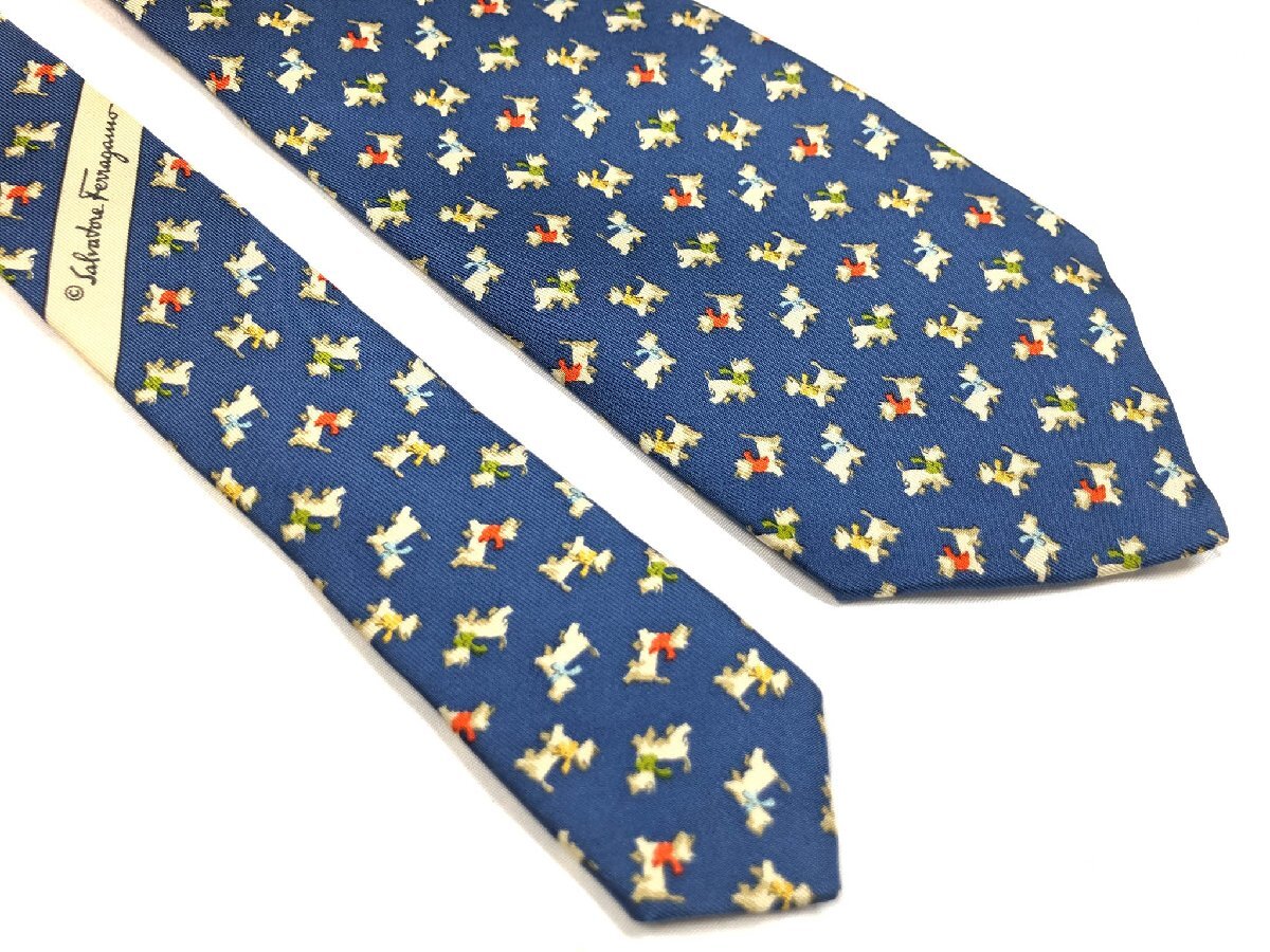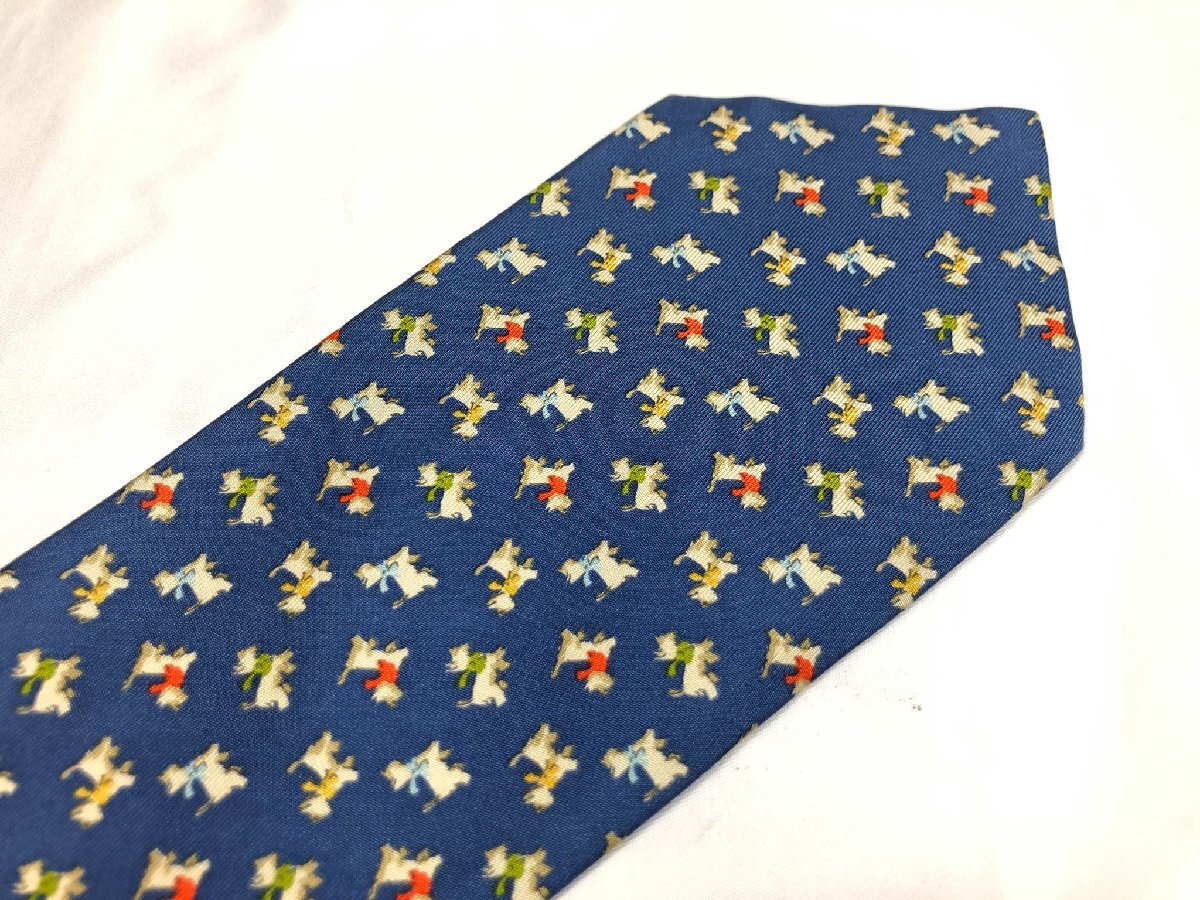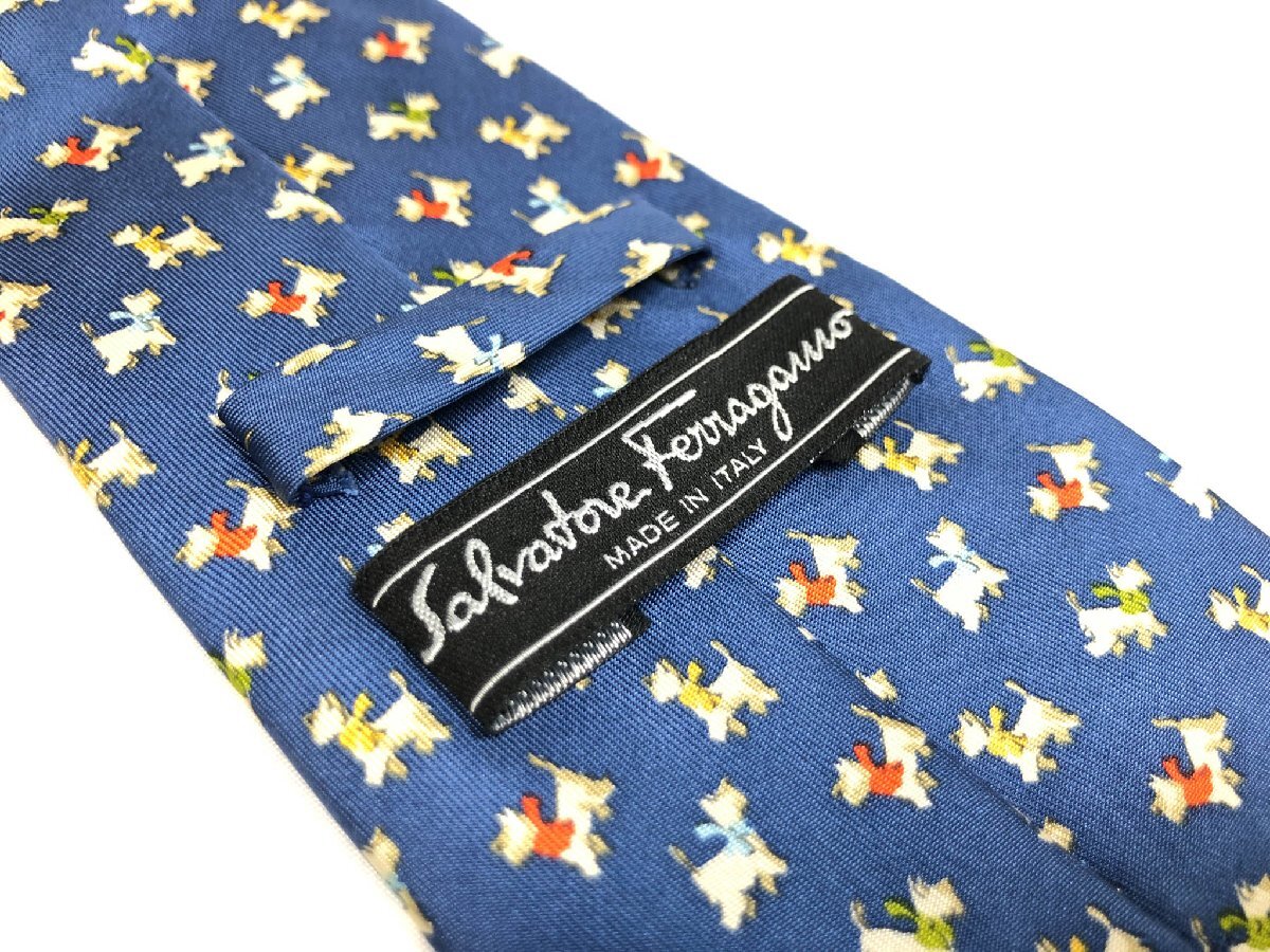 美品【Salvatore Ferragamo サルヴァトーレフェラガモ 】ドッグプリント柄♪ シルク ネクタイ(メンズ)青みのあるネイビー系 伊製◇17MM8713