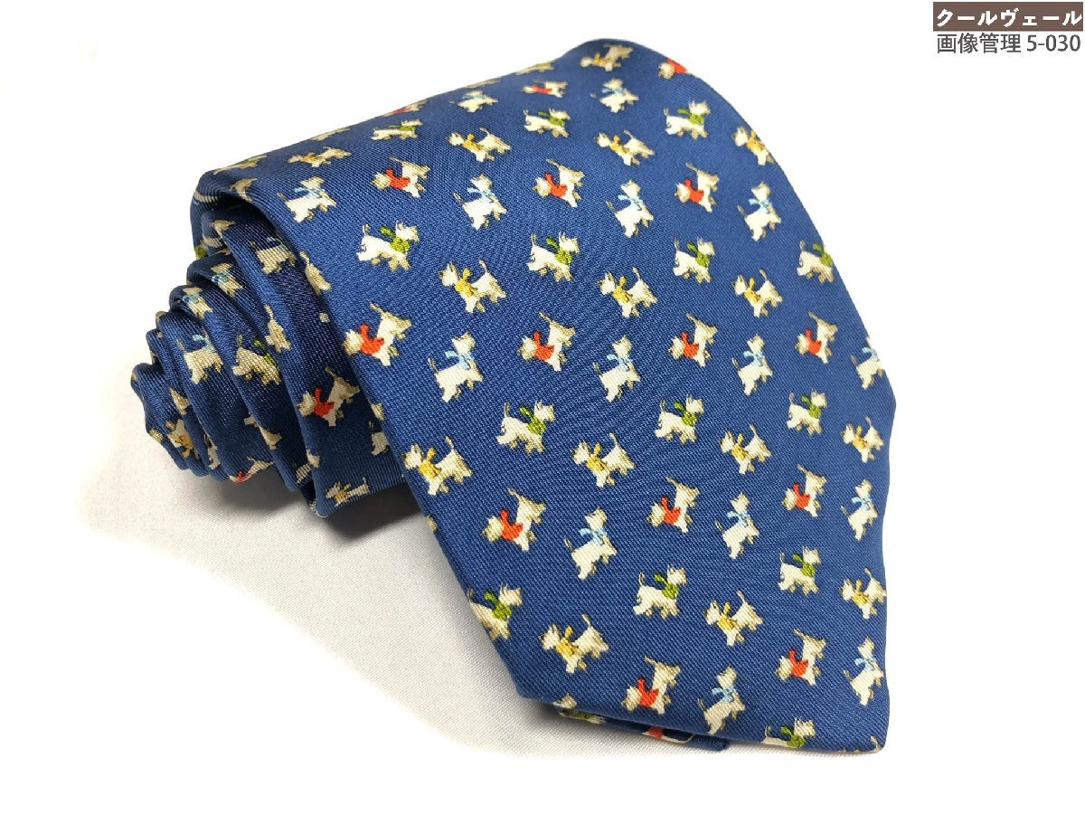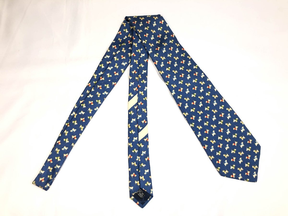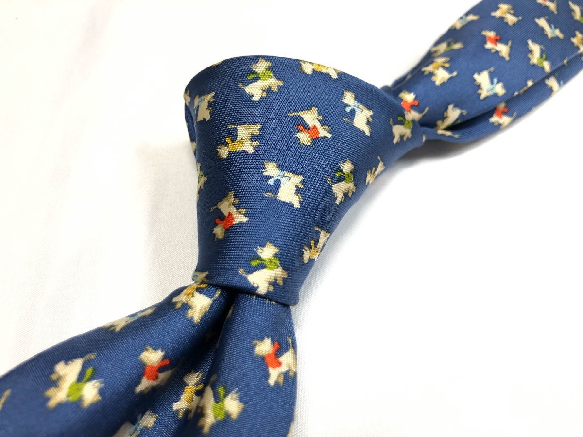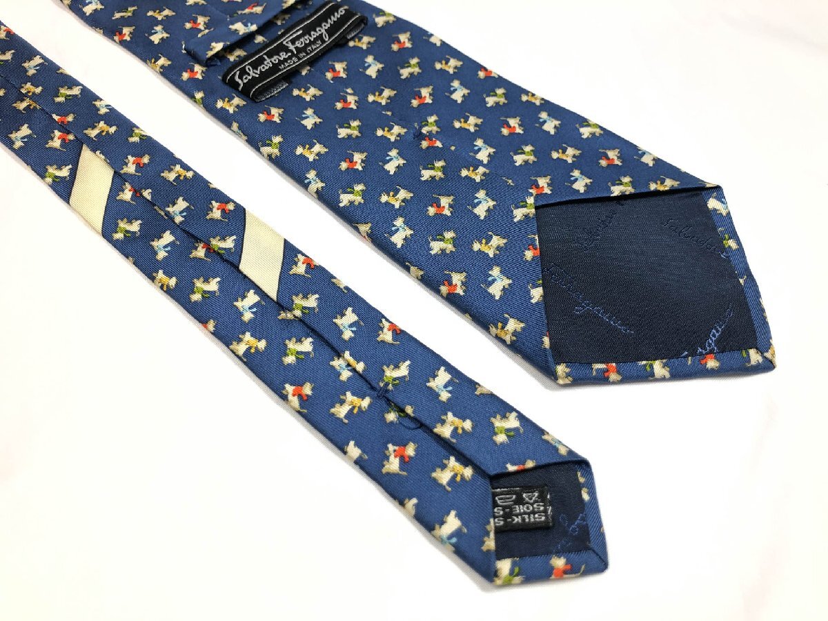 美品【Salvatore Ferragamo サルヴァトーレフェラガモ 】ドッグプリント柄♪ シルク ネクタイ(メンズ)青みのあるネイビー系 伊製◇17MM8713