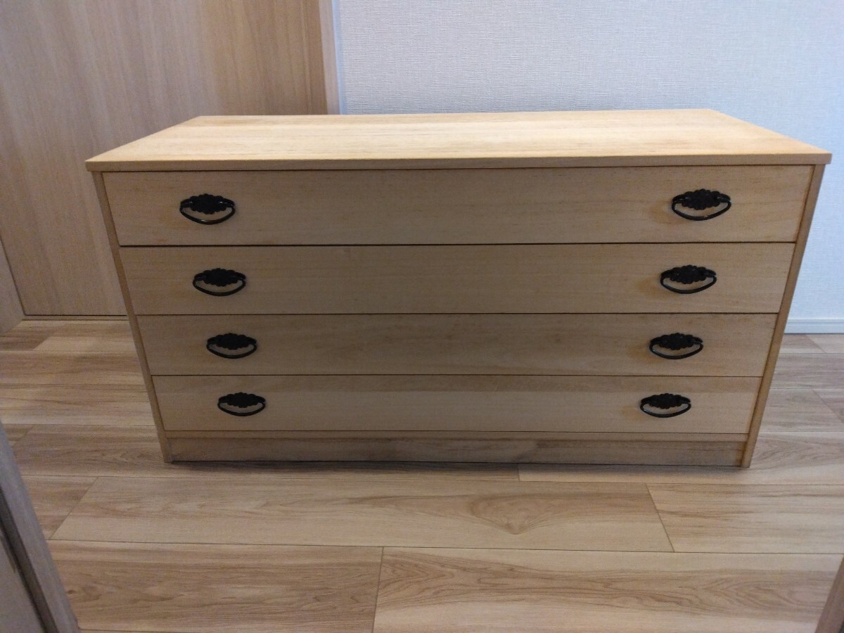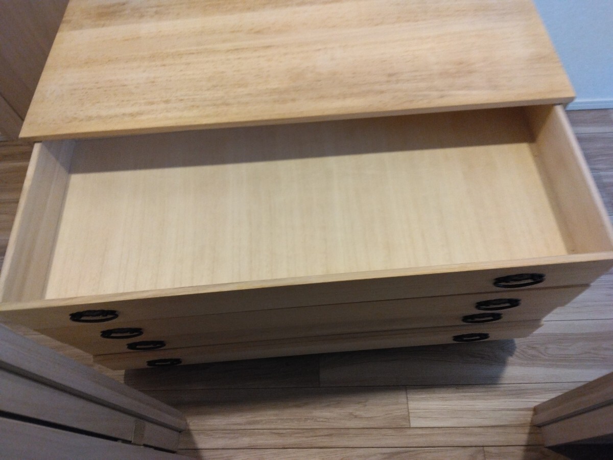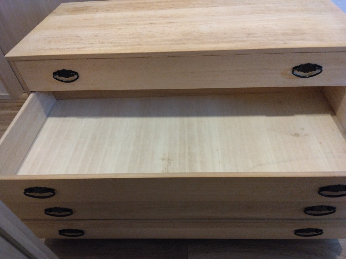 6年前生活協同組合より購入した桐製の4段引き出しの箪笥です。和室にも洋室にも合うシンプルなデザインで、着物などの和装品だけでなく、衣類や小物収納にもお使いいただけます。