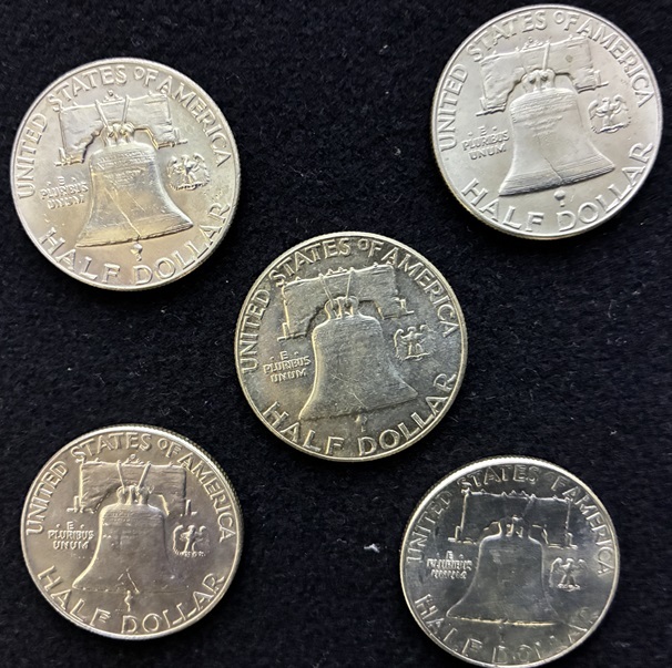 フランクリンハーフダラーのエキスパンディッドシェル1枚とレギュラーコイン4枚のセットです.