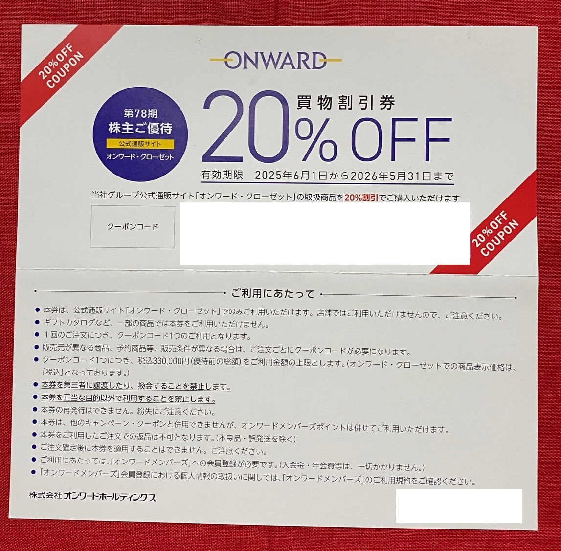 【W】オンワード ONWARD 株主優待 オンワードクローゼット20%OFF クーポンコード×1回分 期限:2026/5/31 コード通知のみ 在庫6