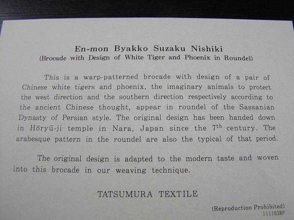 | 分類 | 裂地:「円文白虎朱雀錦-赤」 ( えんもん びゃっこ すざくにしき : En-mon Byakko Suzaku Nishiki-Red ) --------------------------------------------- 【 裂地説明 】 白虎は西方の守護神、朱雀は南方の守護神で、 この裂は法隆寺伝来の錦です。 --------------------------------------------- 【 出帛紗/出袱紗(だしふくさ) 】 表千家では、お濃茶を出す時に、 お茶碗に出帛紗を添えます。 又、香合を飾る時、出帛紗を下に敷いて飾ります。 --------------------------------------------- 茶道のお稽古に 何点あっても重宝する出帛紗。 贈答品としても、ご好評を頂いております。 --------------------------------------------- 型番:d-fukusa-en-mon-byakko-red-tatu |