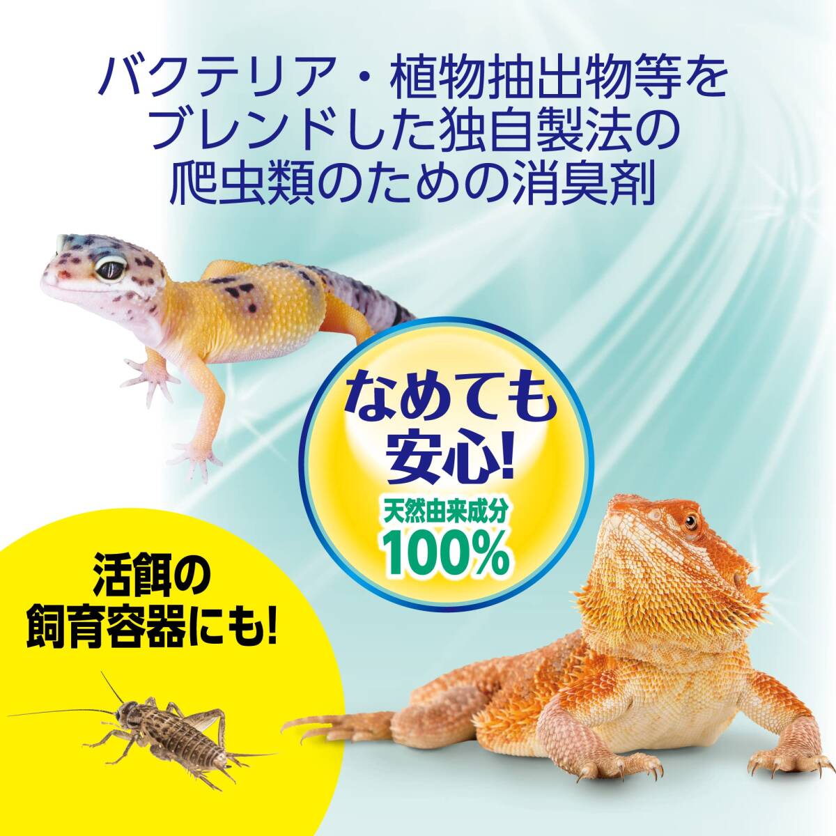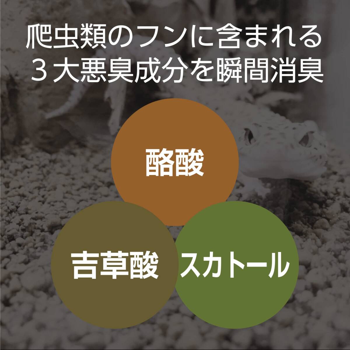商品紹介 爬虫類の消臭剤。天然由来のバクテリアがケージ内の悪臭の元を分解して消臭。なめても安心な天然素材。森林の香り。 使用上の注意 ※本製品は爬虫類飼育専用です。他の目的には使用しないでください。※子供や認知症の方の手の振れない所に保管してください。※誤って飲んだ場合はすぐに大量の水を飲ませてください。また目に入った場合はすぐに水で洗い流してください。どちらも異常が残る場合は、医師に相談してください。※ランプは水に濡れると破損する恐れがあるため、ランプや器具にがかからないようにしてください。※人および爬虫類の身体には直接しないでください。※直射日光を避け、湿気の少ない風通しの良い場所に保管してください。※消臭成分の性質上、水面に白い膜状の物が浮遊したり、白い沈殿物が発生して濁る場合がありますが、効果・効能には問題ありません。※紙製の壁紙、障子に直接吹きかけるとシミや変色する恐れがありますのでご注意ください。 原材料・成分 水、バチルス複合菌液、天然香料 使用方法 1.よく振ってから先端部分を回して「ON」を上にします。 2.床材やニオイが気になる所に直噴または10-20cm離して、2-3回レバーを握ってします。●毎日お使いいただくとより効果があります。●ケージのニオイが気になる場合は多めにしてください。※使用後は先端部分を回して「OFF」を上にし、立てて保管してください。※直射日光を避け、湿気の少ない風通しの良い場所に保管してください。 ※製品の仕様、デザイン、価格等予告なく変更することがあります。