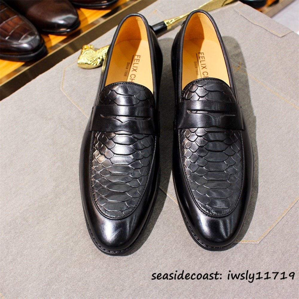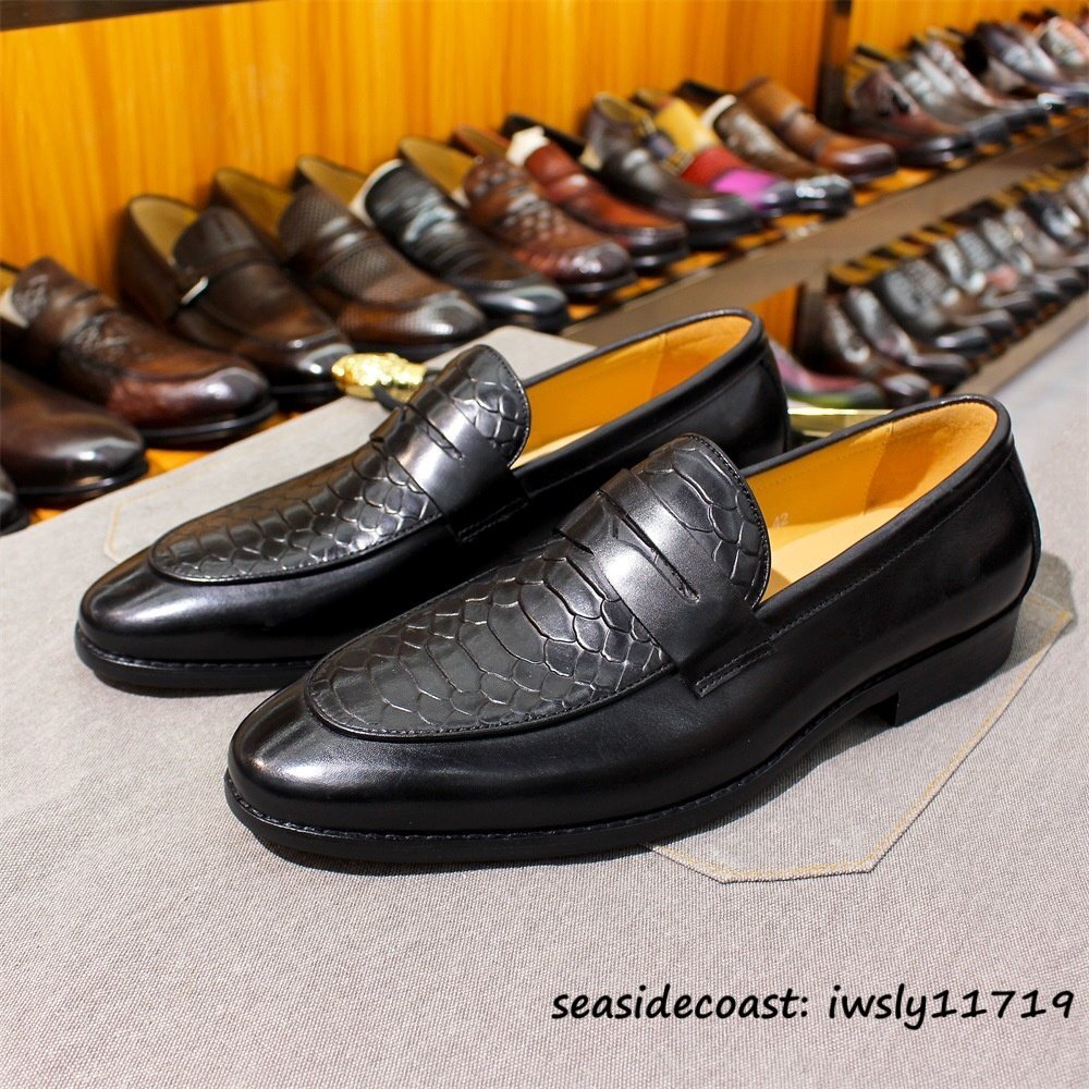 極美品★本革レザーシューズ 牛革 鰐柄 ビジネスシューズ メンズ ローファー スリッポン 職人手作り 紳士靴 フォーマ 革靴 ブラック 25.0cm