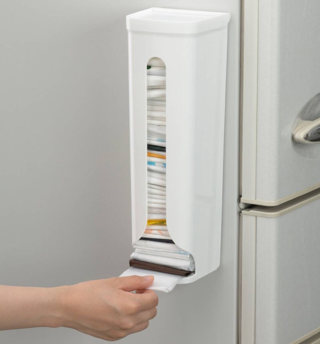 商品紹介 ●かさばるレジ袋をスッキリ収納。●付属のマグネットと吸盤でしっかり設置。盤面によって選べる便利な、2種類の組み合わせ! より ●毎日のお買い物でどんどん増えていくレジ袋をスッキリ収納 ●上から入れて下から取り出す方式なので、収納も取り出しもカンタン ●取り付けは壁面によってマグネットか吸盤の2種類から選べる ●繰り返し使える吸盤用の補助シール付