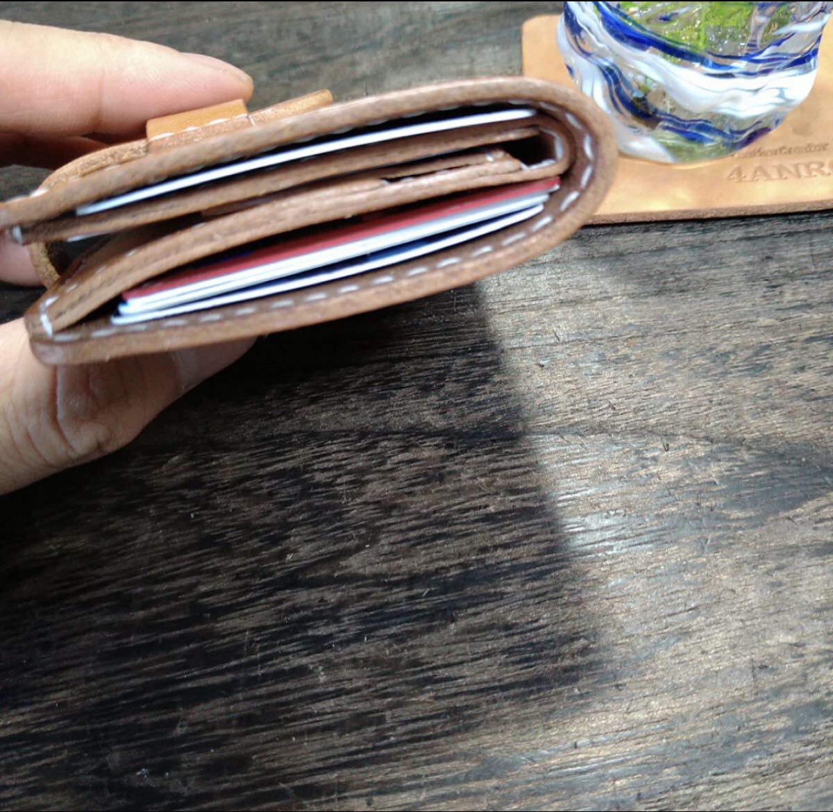 手のひらサイズで胸ポケットにも入るものは入ります。カードが多数入り、お札は折り曲げれば入りますが主に画像のようにカード入れが最適だと思います。小銭は数枚なら入れられるよう制作しました。