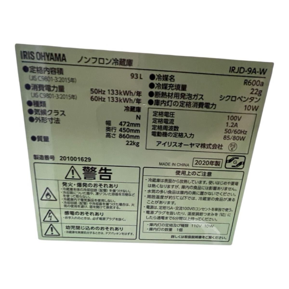アイリスオーヤマ 冷蔵庫 IRJD-9A-W(2020年製) の出品です。