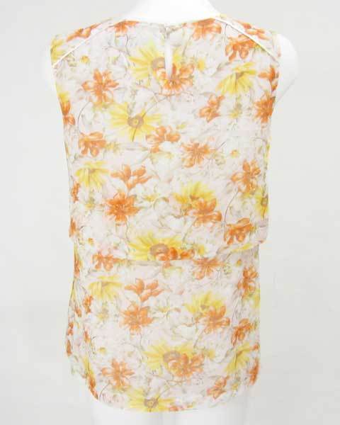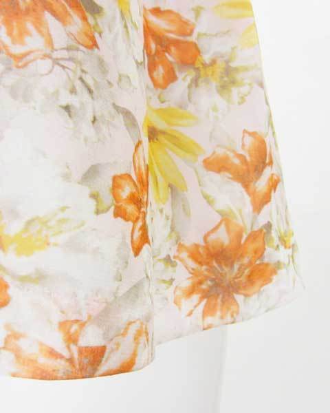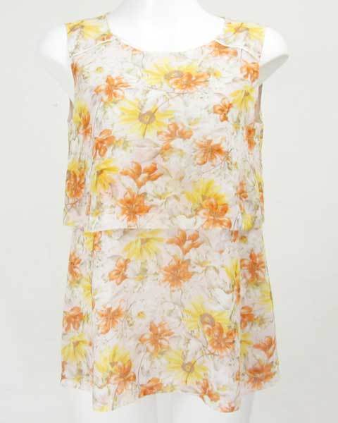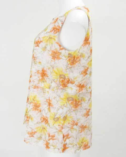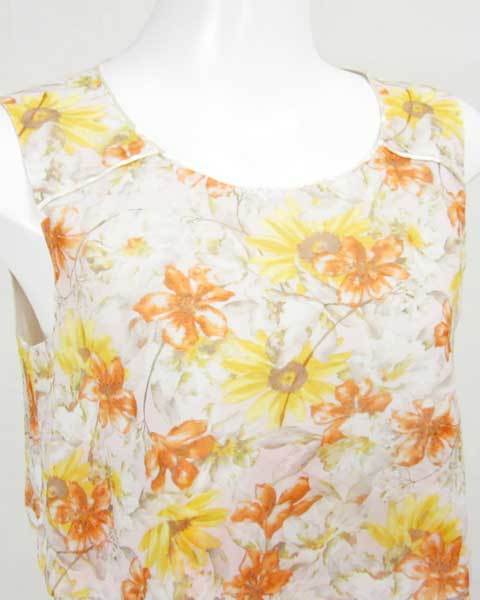 ベージュ地にオレンジとイエロー系の花柄プリントされたエレガンスなアイテムノースリーブタイプですのでインナーとしても一枚でもお使いいただけます♪少しフレアーシルエットになっていて◎ |