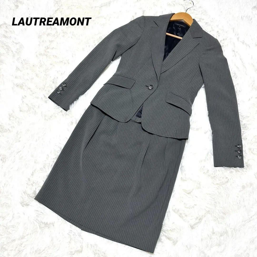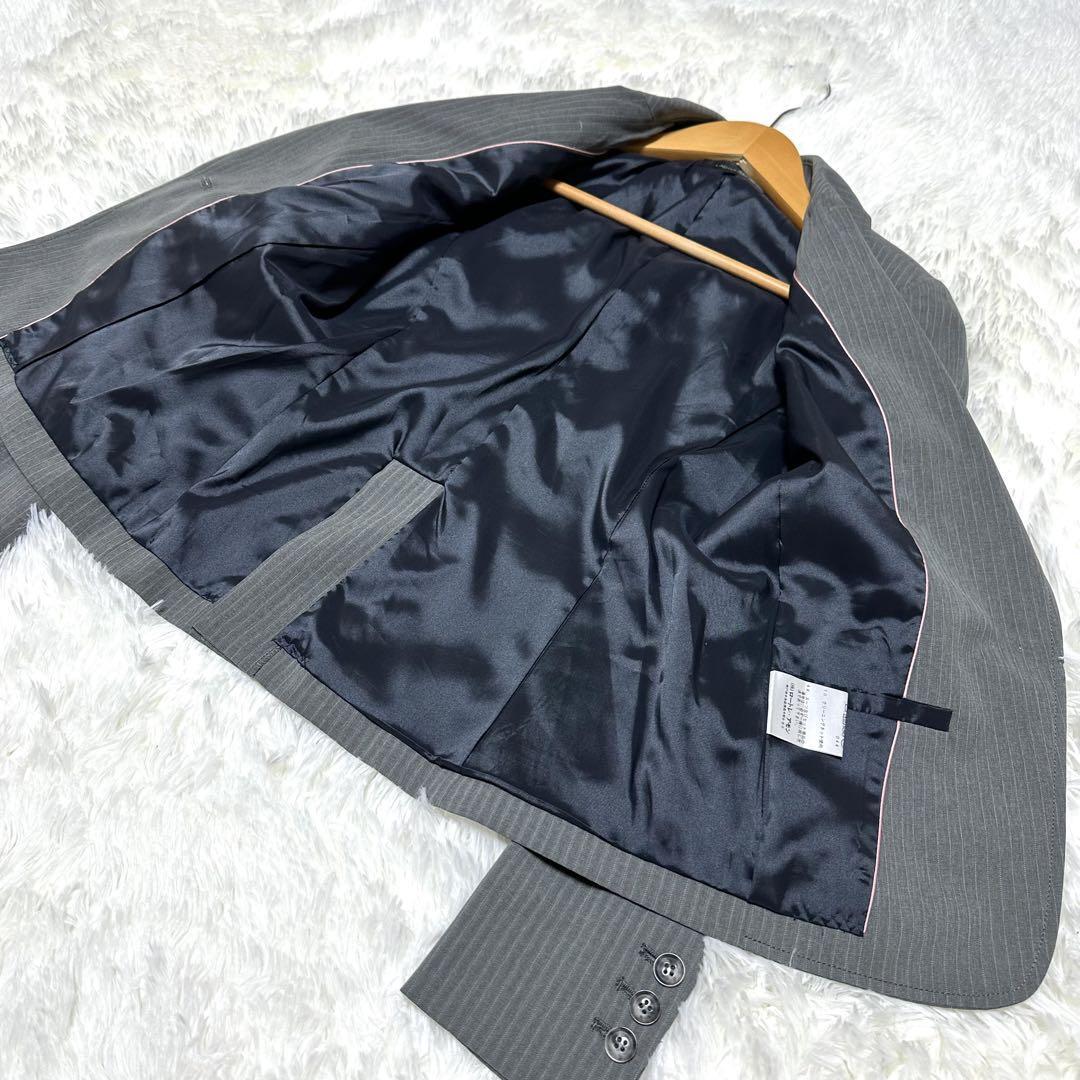 エレガントなグレーのストライプスーツセットです!上質な素材で仕上げられたジャケットとスカートの組み合わせは、ビジネスシーンやフォーマルな場面に最適。ジャケットはシングルボタンで、袖口の装飾がアクセントに。スカートは膝丈で、すっきりとしたシルエットが魅力的。