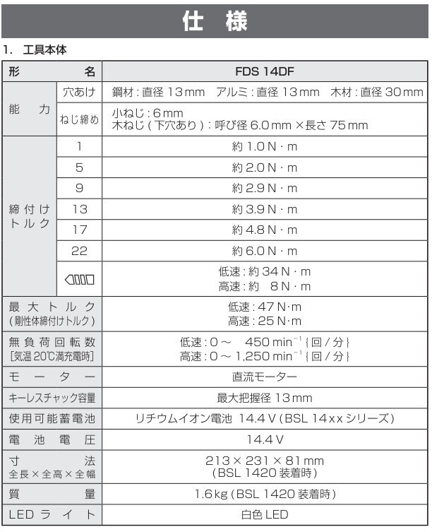 ■付属品:蓄電池(BSL1420)×1個、急速充電器(UC18YKSL)、ケース、No.2プラスビット×1、電池カバー×1