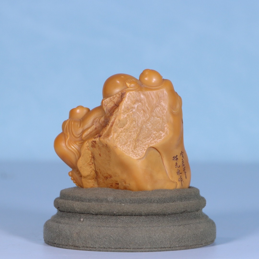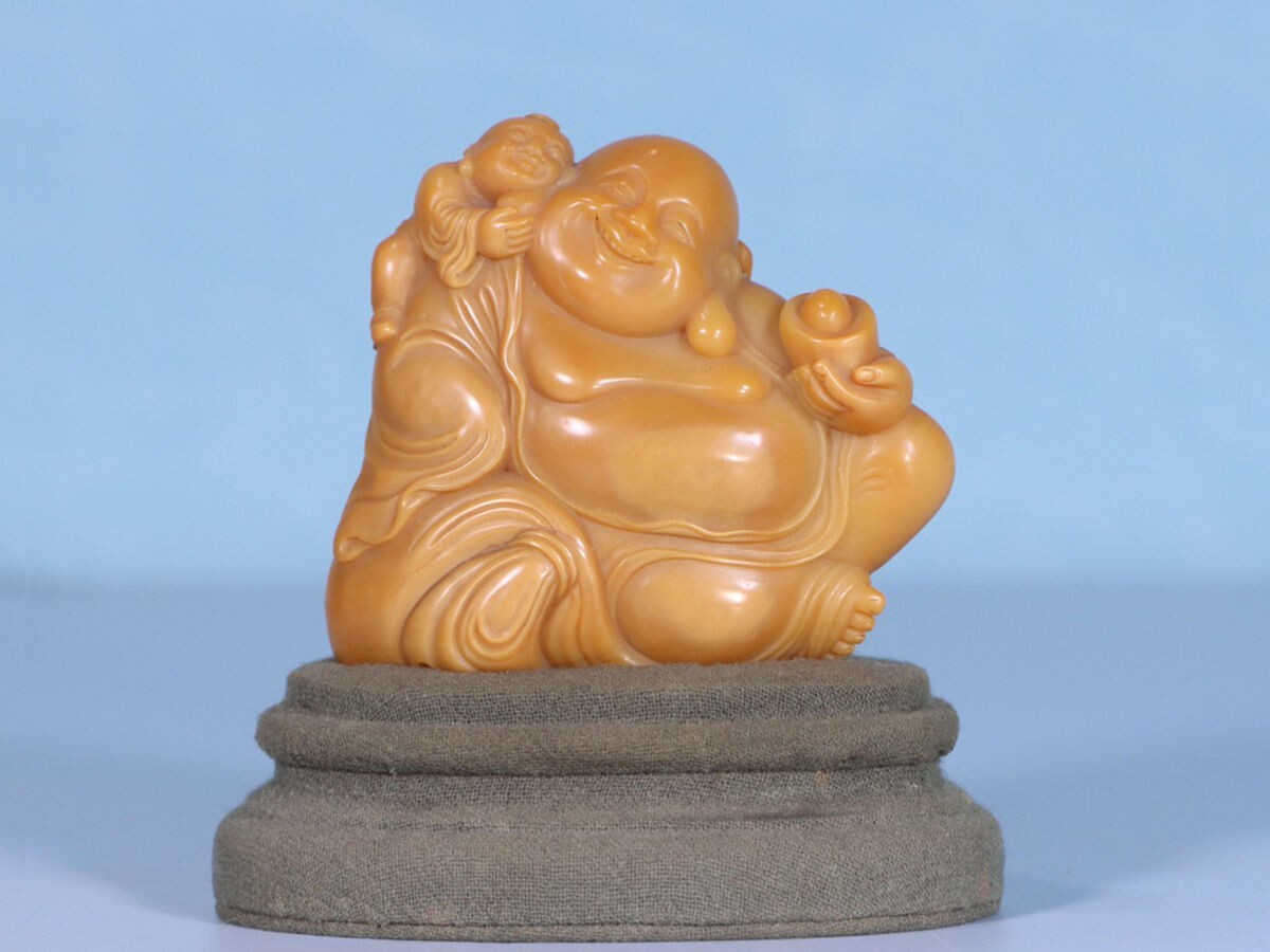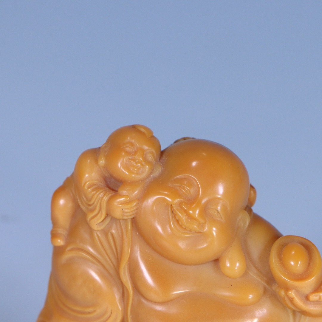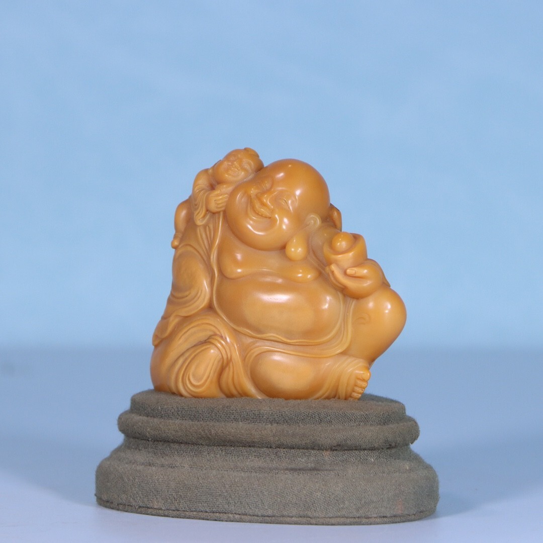 「清 林元水作 老寿山石 田黄石彫り 童子弥勒笑仏」極細工 擺件 古賞物 中国古美術 旧蔵出