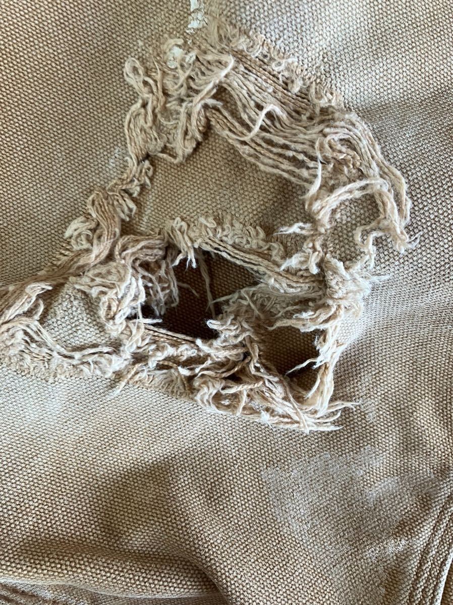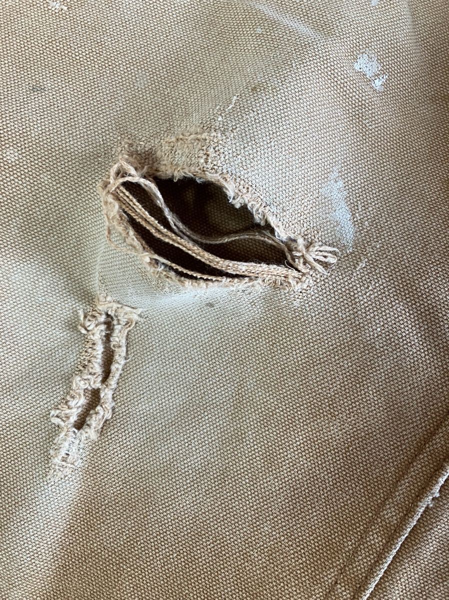 ダック地で全体的にフェードやクラッシュ、ペンキ痕が雰囲気抜群です。ダブルニーの右膝は一枚目までクラッシュ、左膝は二枚目までクラッシュしています。サスペンダー部分のゴムはまだ充分テンションが効いてます。