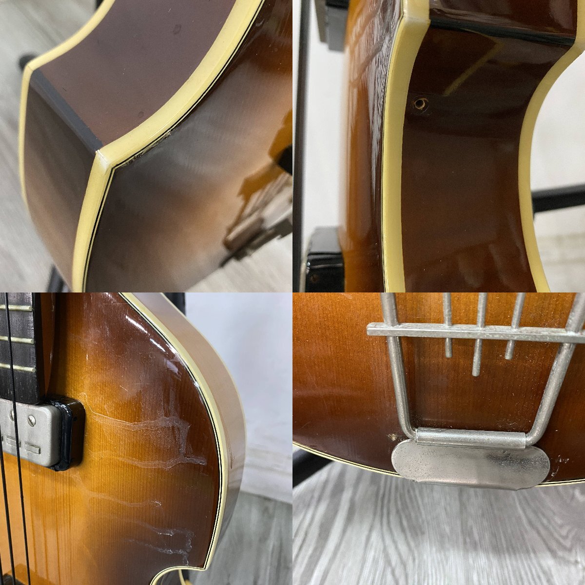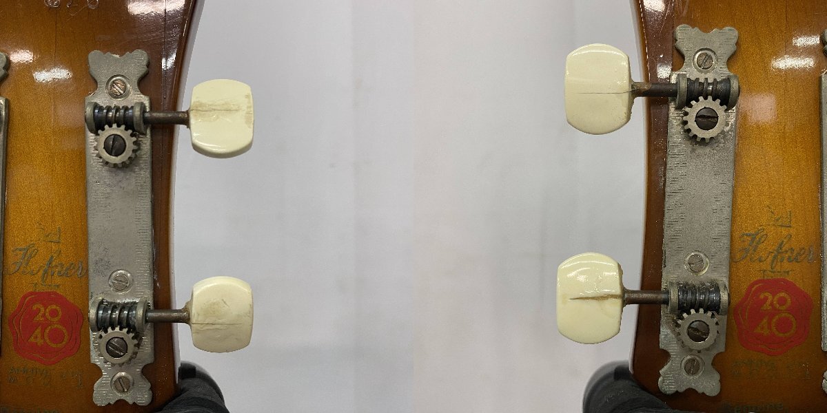 ◆外観◆ ・★キズ、汚れ、使用感があります。 ・★ペグに破損、補修跡がございます。 ・★ネックヒールに浮きがございます。 ・★接着剤の跡がございます。 ・★ケースの留め具に破損がございます。 ・★経年劣化による臭いがございます。 ・★側面に穴がございます。 |