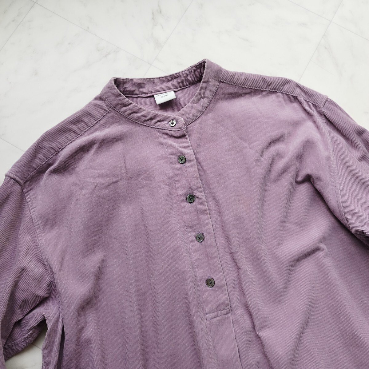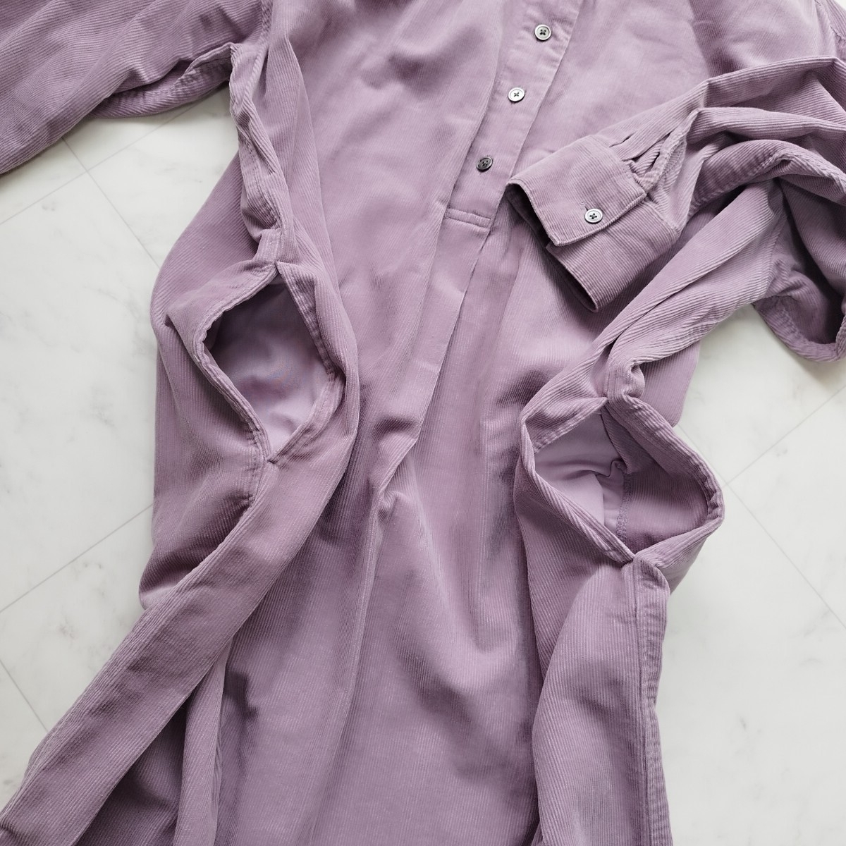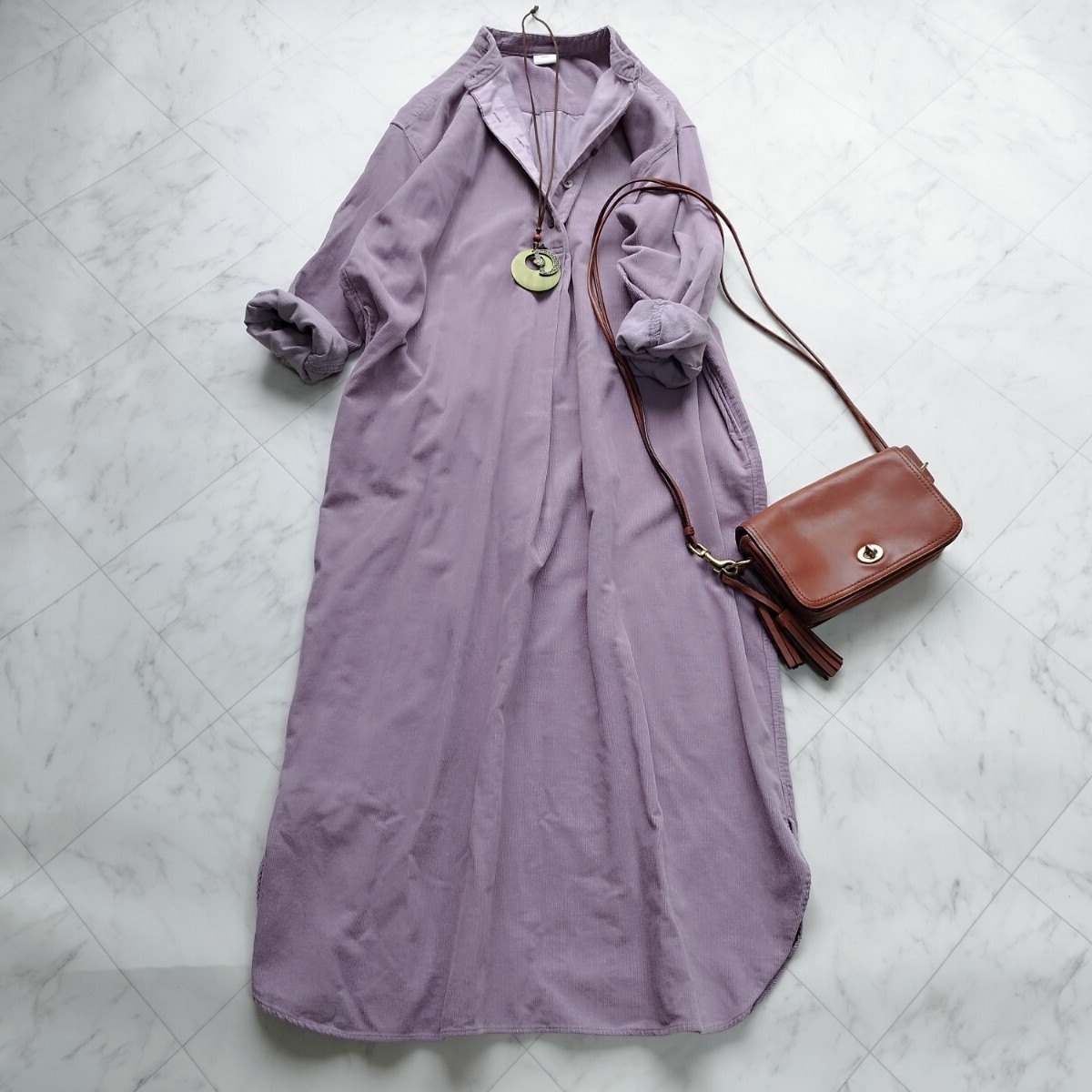 季節を感じさせる膨らみのあるコーデュロイ生地で、ノーカラーのシンプルなワンピース
