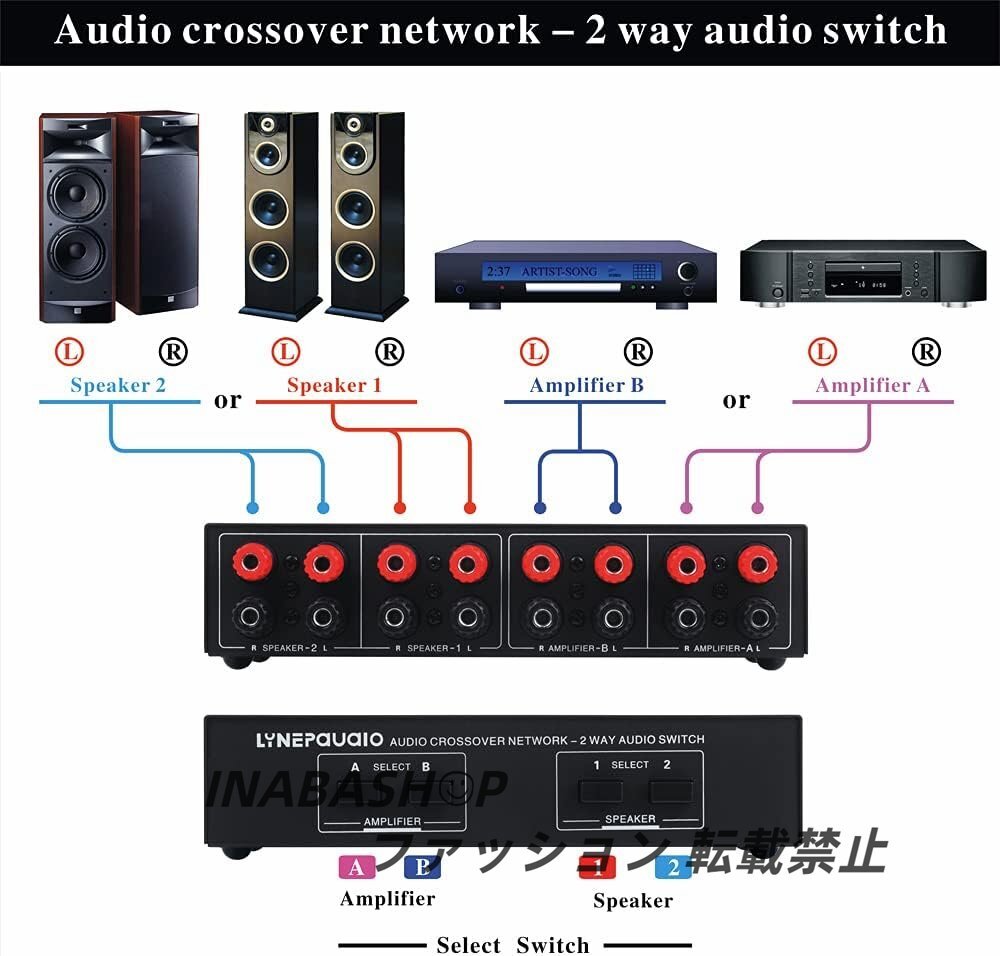 2セットのアンプ入力と2セットのスピーカー出力を提供し、それぞれに独立したスイッチが付いています。