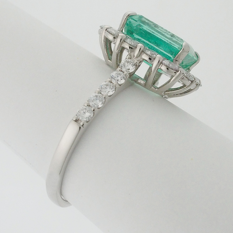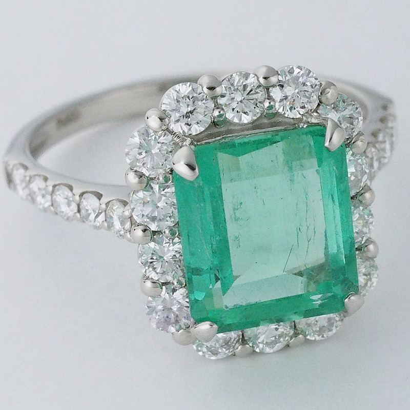 エメラルドをセンターにセットし、煌めくダイヤモンドで飾り立てた、プラチナ900製のデザインリングです。
