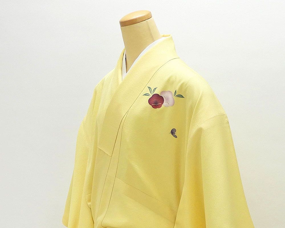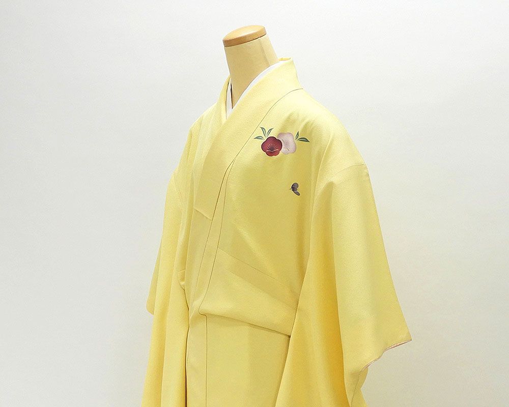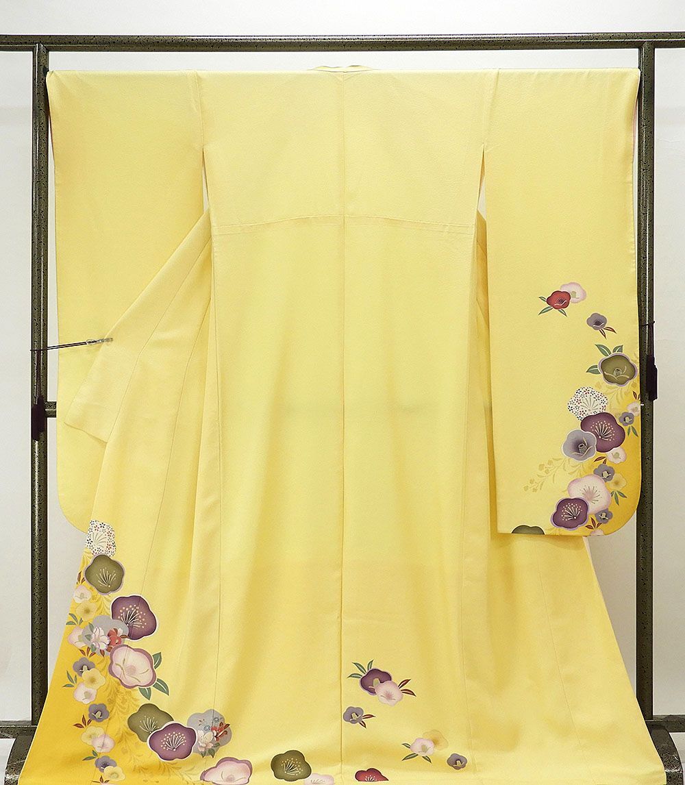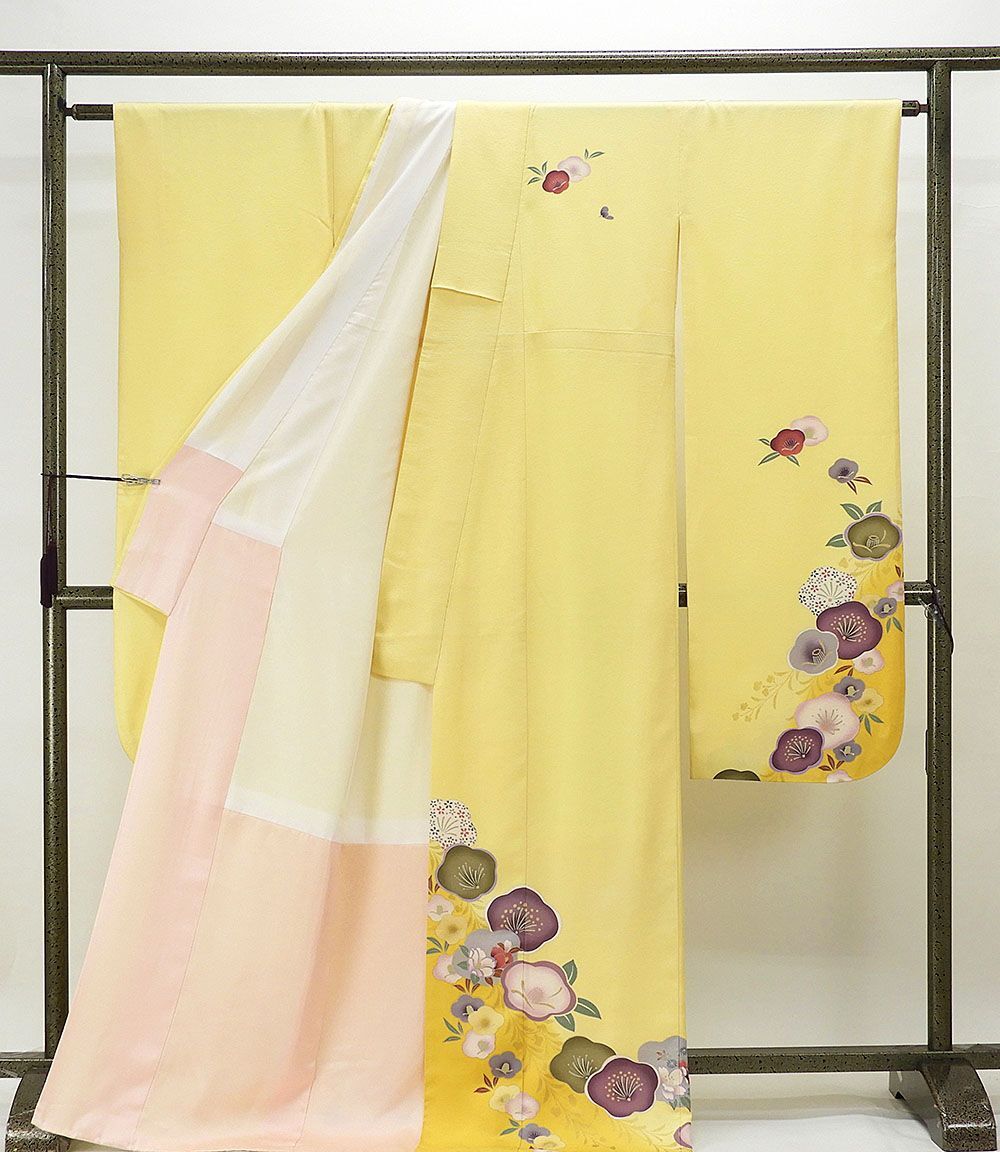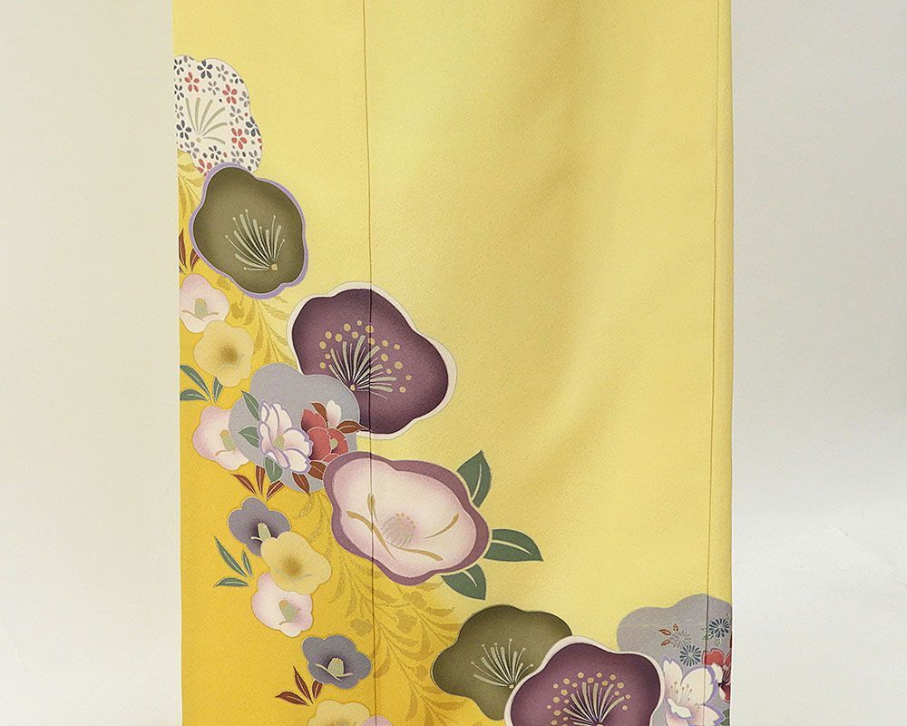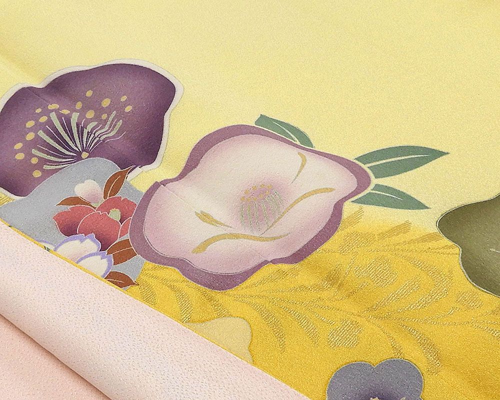 たたき地紋のレモン色地に山吹色の裾ぼかしと多色と金箔で四季花模様が柄付けされています。