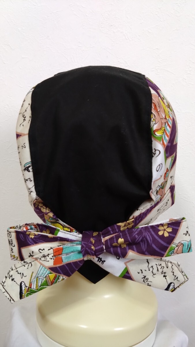 短★バンダナキャップ★ハンドメイド 和柄 百人一首×無地 かるた 紫