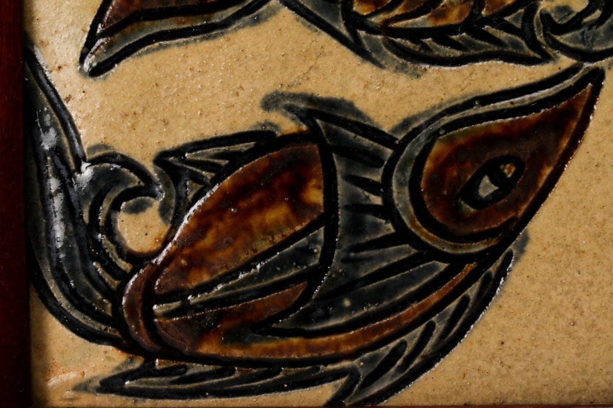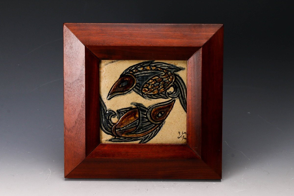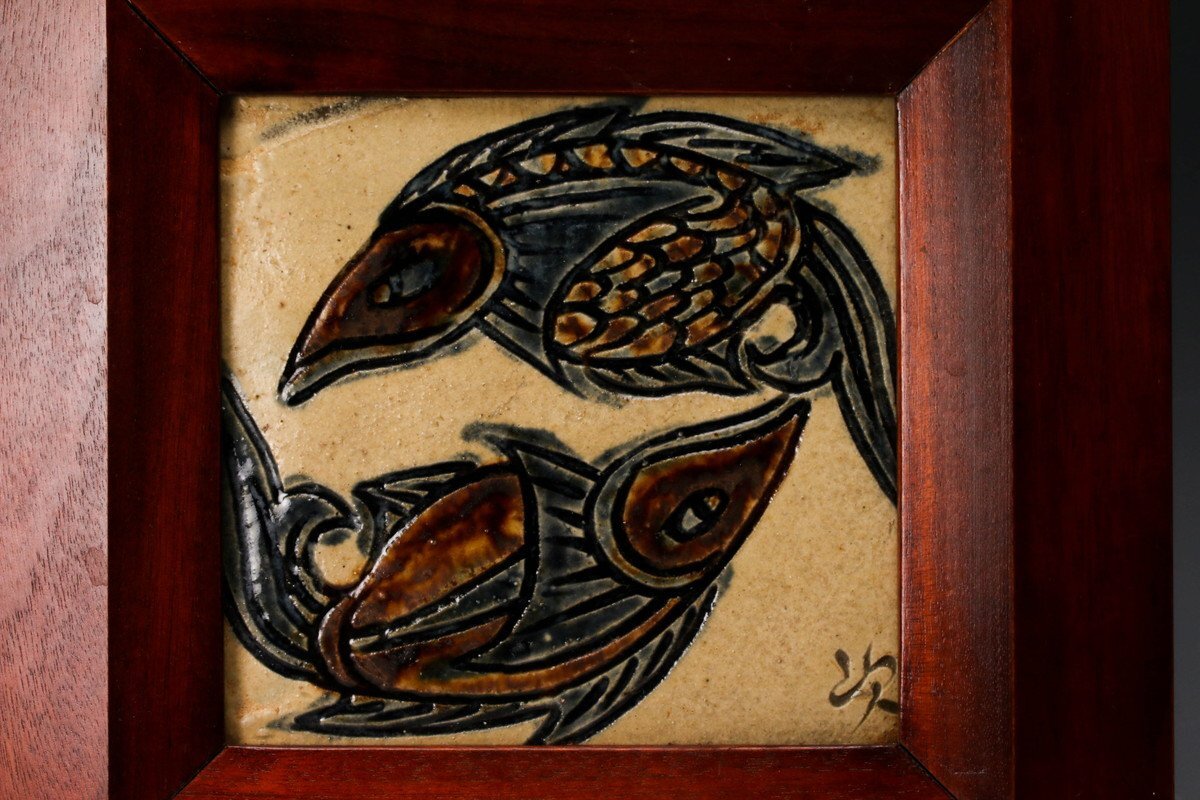 【佳香】人間国宝 金城次郎 双魚文陶板 額装 本物保証