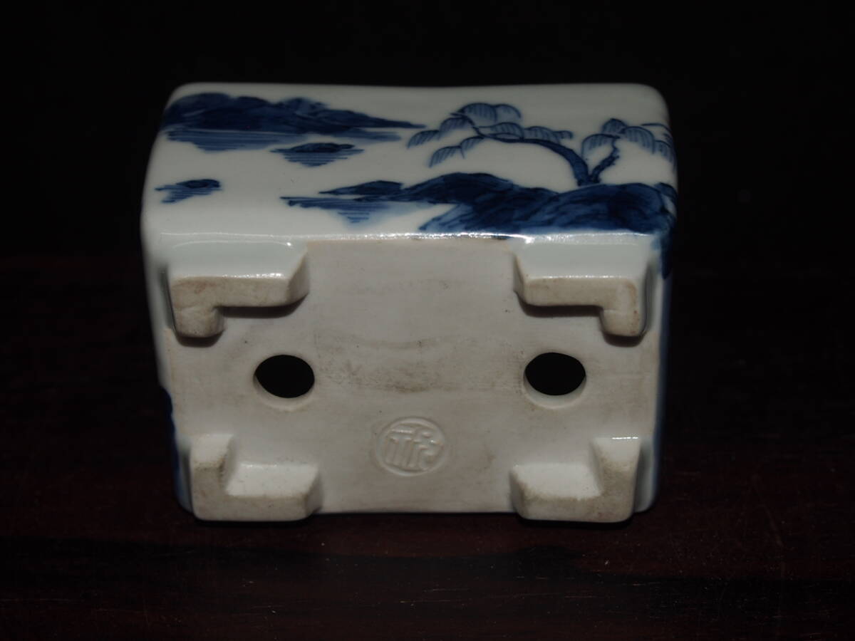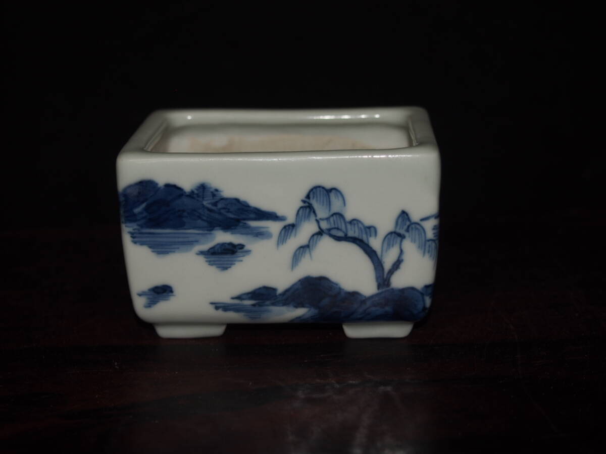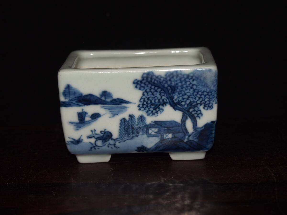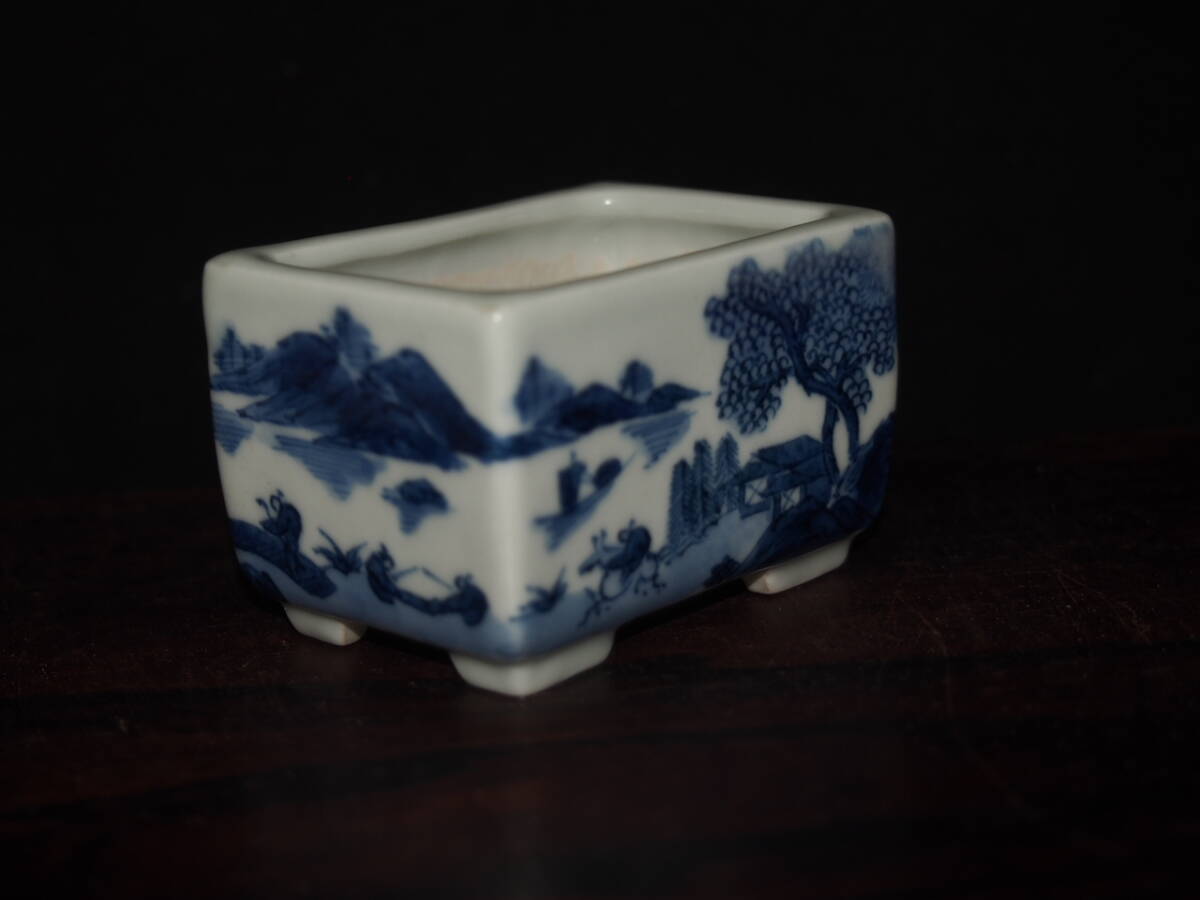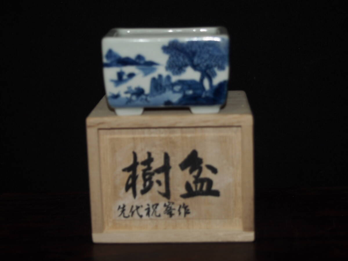 『大和魂』【先代祝峯】染付山水騎馬賢人図反縁切脚長方鉢・巾6.5cm・氏の代表格絵付・時代付・箱付・人気物故作家 | ||